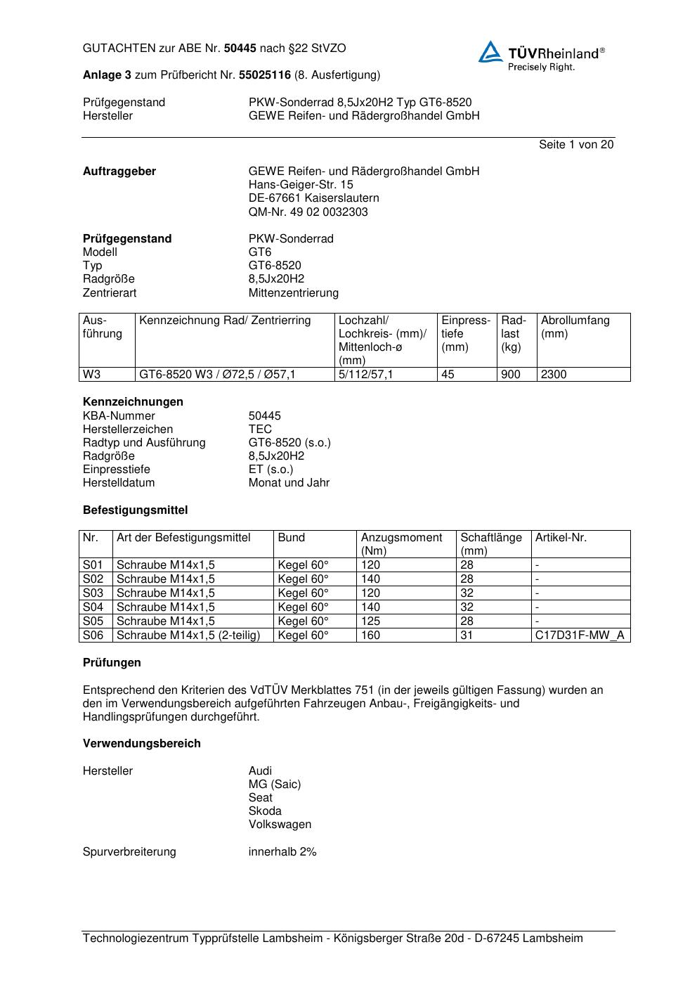 Dieses Gutachten (abe) bezieht sich auf die Alufelge GEWE GT6-8520 in der Ausführung ET 0, Mittenloch 0 mm (KBA 50445). Im PDF findest du typischerweise zulässige Reifengrößen, Auflagen/Anbauhinweise und – je nach Dokument – Hinweise zur Eintragung.