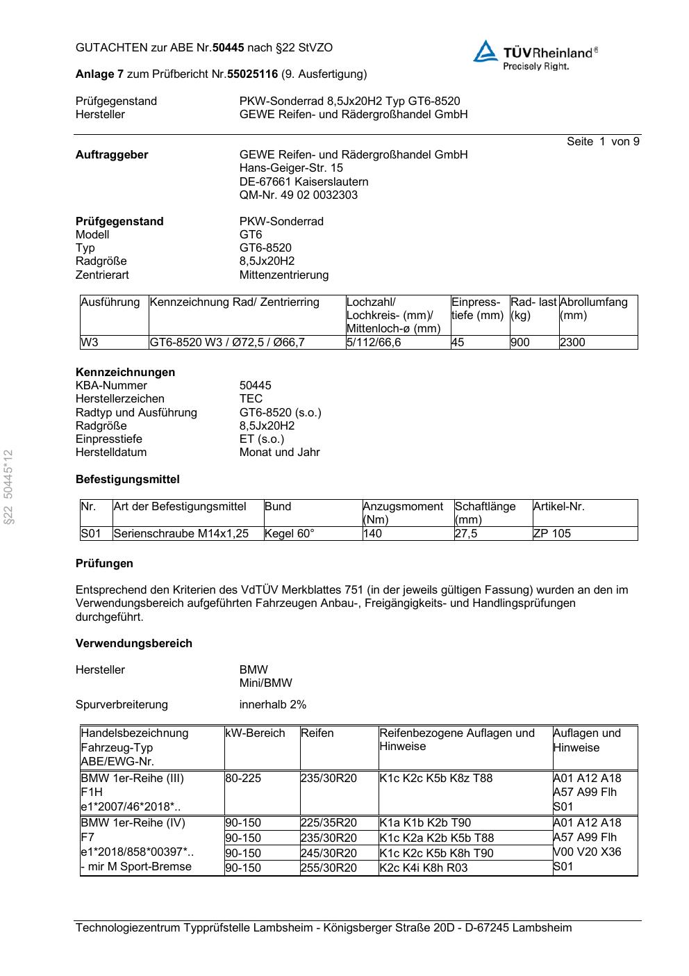 Dieses Gutachten (abe) bezieht sich auf die Alufelge GEWE GT6-8520 in der Ausführung ET 0, Mittenloch 0 mm (KBA 50445). Im PDF findest du typischerweise zulässige Reifengrößen, Auflagen/Anbauhinweise und – je nach Dokument – Hinweise zur Eintragung.