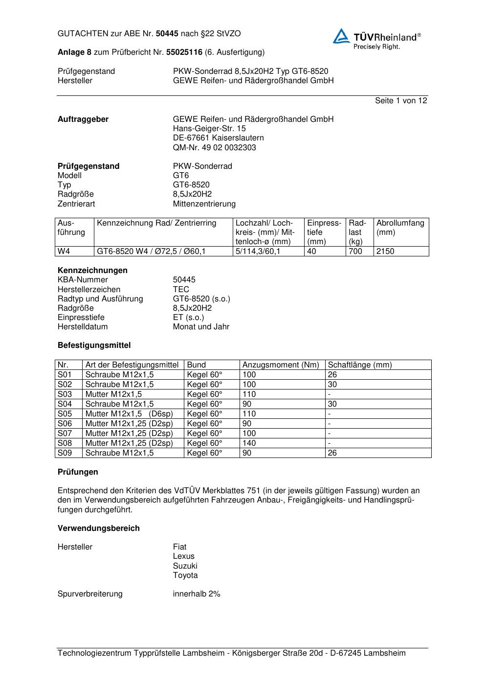 Dieses Gutachten (abe) bezieht sich auf die Alufelge GEWE GT6-8520 in der Ausführung ET 0, Mittenloch 0 mm (KBA 50445). Im PDF findest du typischerweise zulässige Reifengrößen, Auflagen/Anbauhinweise und – je nach Dokument – Hinweise zur Eintragung.
