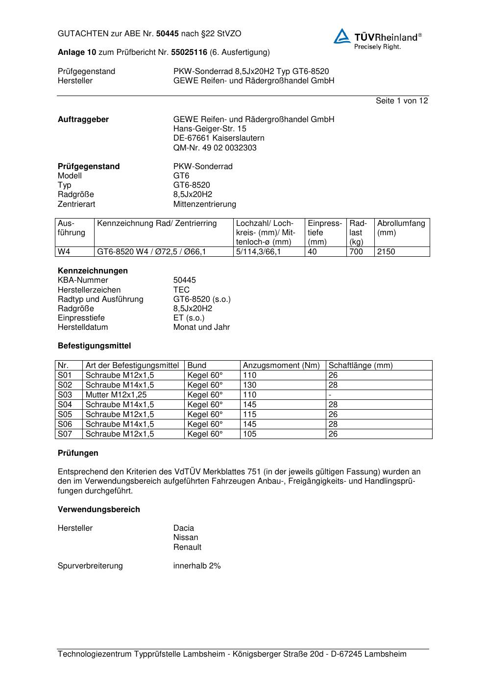 Dieses Gutachten (abe) bezieht sich auf die Alufelge GEWE GT6-8520 in der Ausführung ET 0, Mittenloch 0 mm (KBA 50445). Im PDF findest du typischerweise zulässige Reifengrößen, Auflagen/Anbauhinweise und – je nach Dokument – Hinweise zur Eintragung.