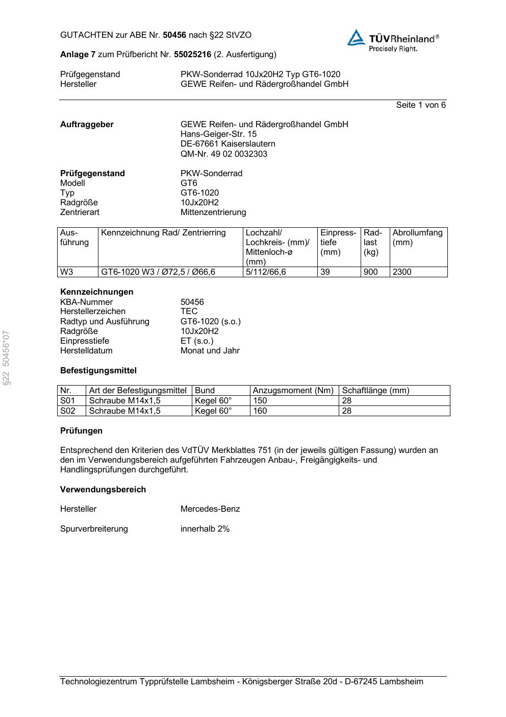 Dieses Gutachten (abe) bezieht sich auf die Alufelge GEWE GT6-1020 in der Ausführung ET 0, Mittenloch 0 mm (KBA 50456). Im PDF findest du typischerweise zulässige Reifengrößen, Auflagen/Anbauhinweise und – je nach Dokument – Hinweise zur Eintragung.