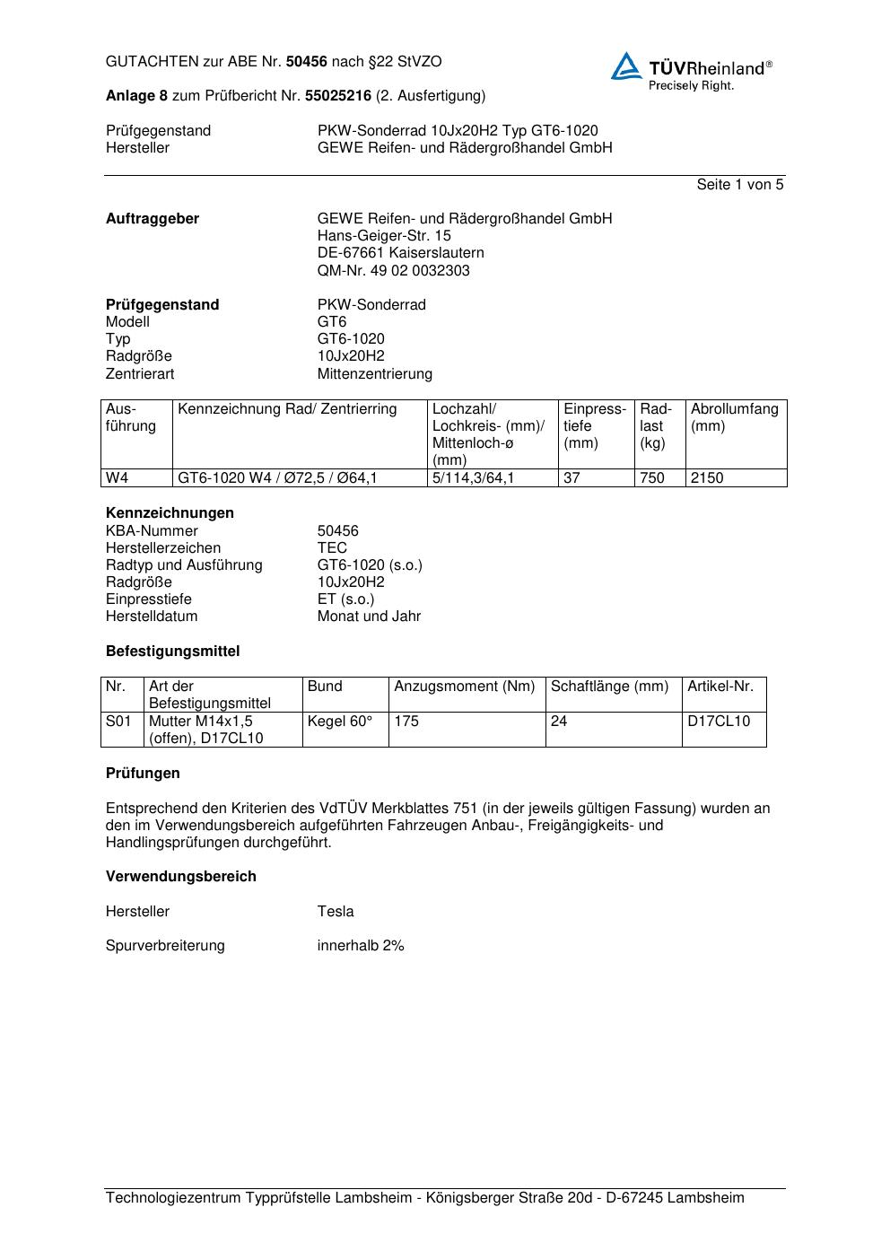Dieses Gutachten (abe) bezieht sich auf die Alufelge GEWE GT6-1020 in der Ausführung ET 0, Mittenloch 0 mm (KBA 50456). Im PDF findest du typischerweise zulässige Reifengrößen, Auflagen/Anbauhinweise und – je nach Dokument – Hinweise zur Eintragung.