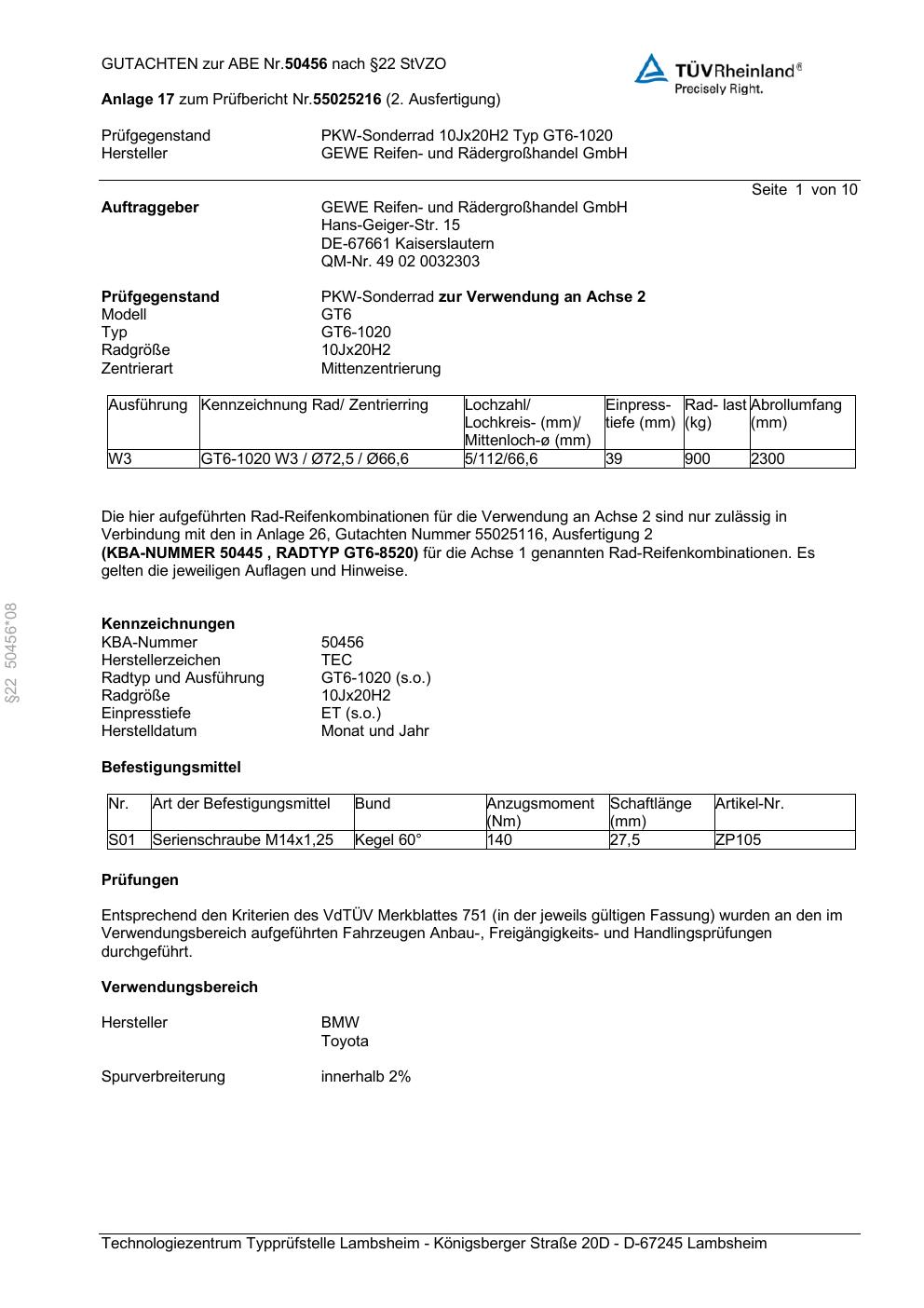 Dieses Gutachten (abe) bezieht sich auf die Alufelge GEWE GT6-1020 in der Ausführung ET 0, Mittenloch 0 mm (KBA 50456). Im PDF findest du typischerweise zulässige Reifengrößen, Auflagen/Anbauhinweise und – je nach Dokument – Hinweise zur Eintragung.
