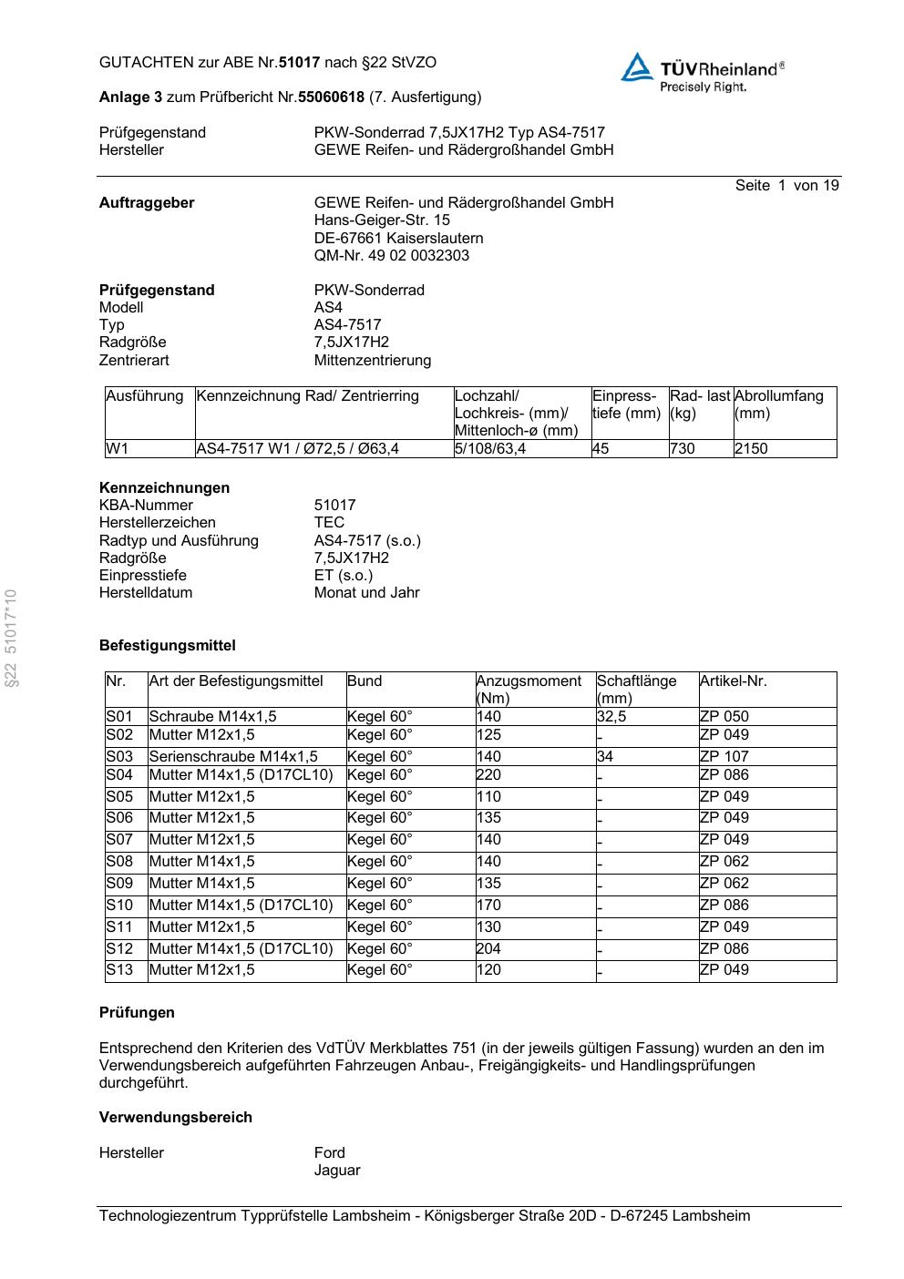 Dieses Gutachten (abe) bezieht sich auf die Alufelge GEWE AS4-7517 in der Ausführung ET 0, Mittenloch 0 mm (KBA 51017). Im PDF findest du typischerweise zulässige Reifengrößen, Auflagen/Anbauhinweise und – je nach Dokument – Hinweise zur Eintragung.