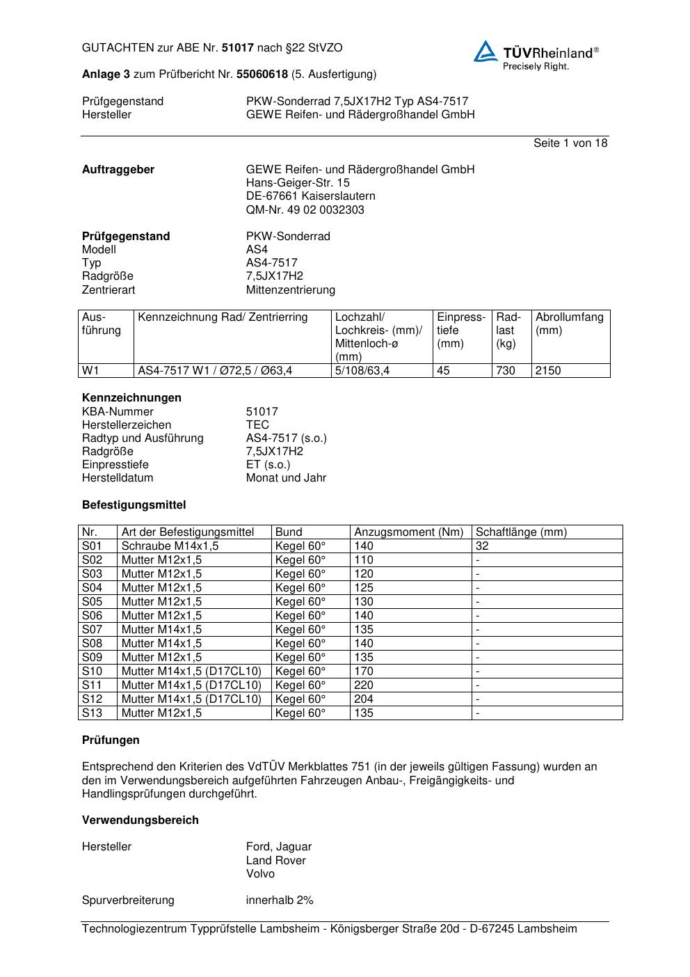 Dieses Gutachten (abe) bezieht sich auf die Alufelge GEWE AS4-7517 in der Ausführung ET 0, Mittenloch 0 mm (KBA 51017). Im PDF findest du typischerweise zulässige Reifengrößen, Auflagen/Anbauhinweise und – je nach Dokument – Hinweise zur Eintragung.