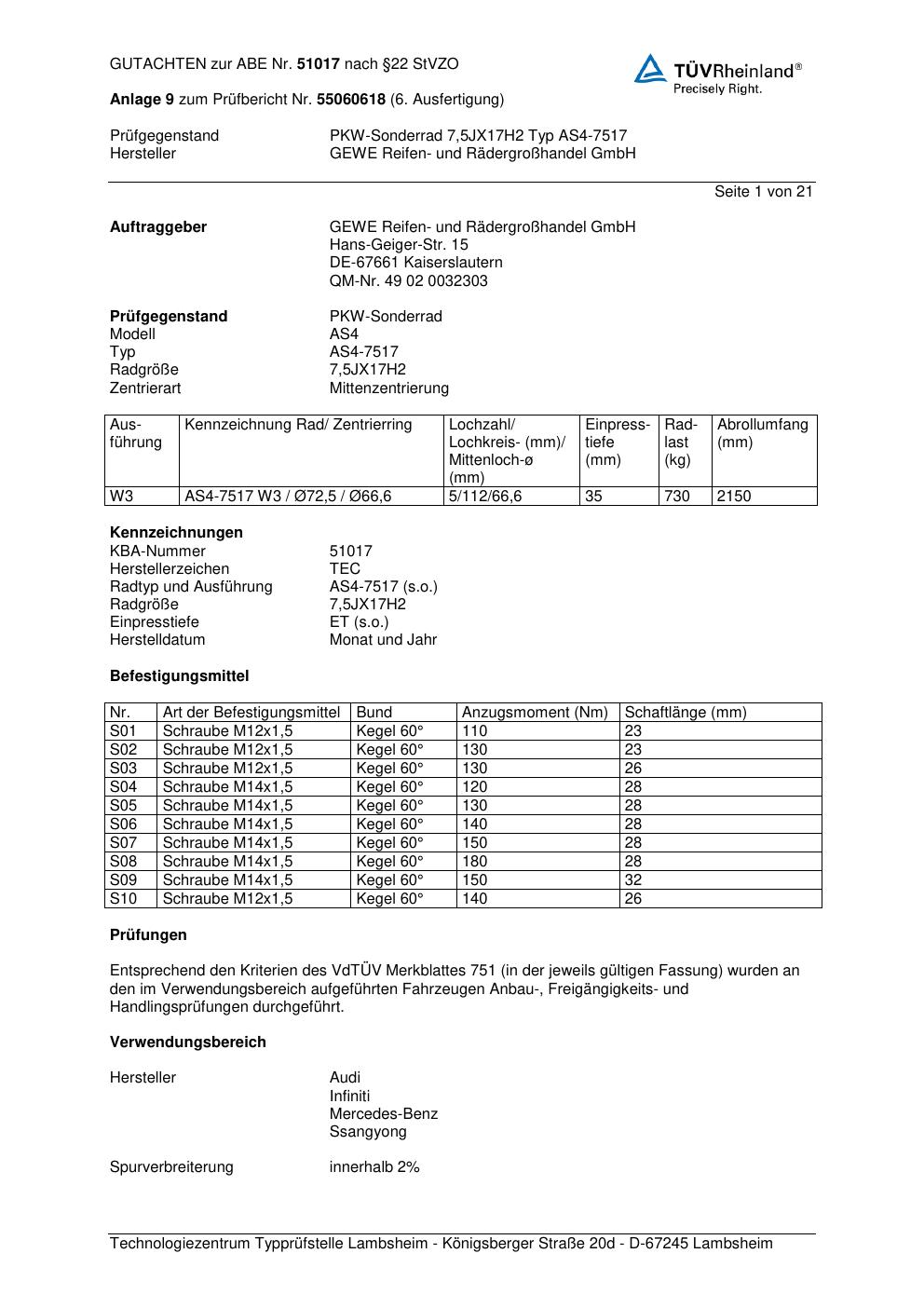 Dieses Gutachten (abe) bezieht sich auf die Alufelge GEWE AS4-7517 in der Ausführung ET 0, Mittenloch 0 mm (KBA 51017). Im PDF findest du typischerweise zulässige Reifengrößen, Auflagen/Anbauhinweise und – je nach Dokument – Hinweise zur Eintragung.
