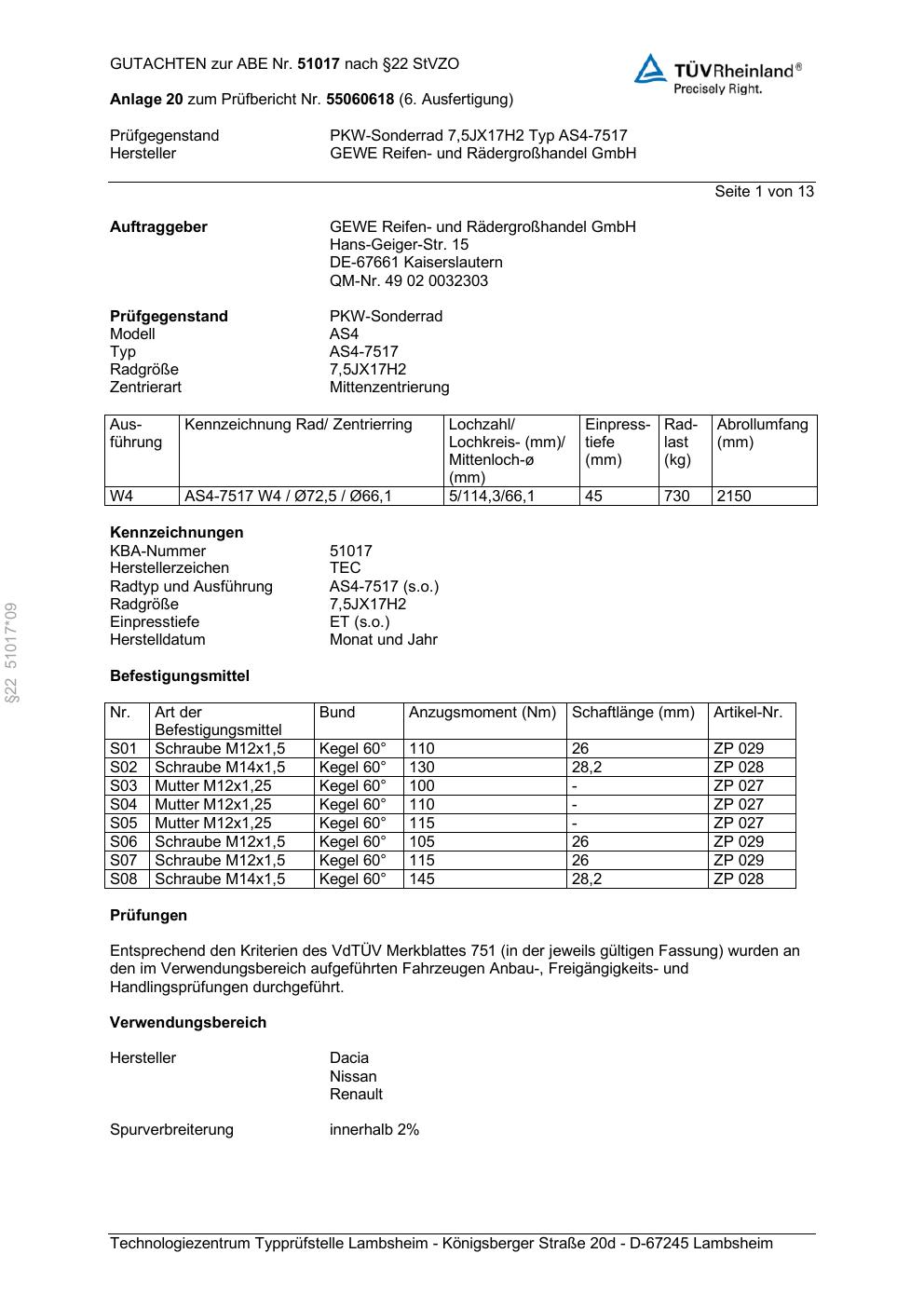 Dieses Gutachten (abe) bezieht sich auf die Alufelge GEWE AS4-7517 in der Ausführung ET 0, Mittenloch 0 mm (KBA 51017). Im PDF findest du typischerweise zulässige Reifengrößen, Auflagen/Anbauhinweise und – je nach Dokument – Hinweise zur Eintragung.