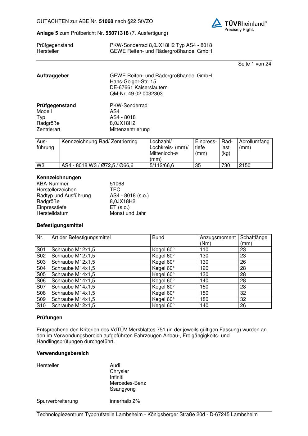 Felgengutachten / abe für Alufelgen GEWE AS4 - 80 18 (ET 0, Mittenloch 0 mm) mit KBA 51068 (Zertifikatsnummer 51068). Hier kostenlos als PDF herunterladen. Der Download-Link ist 24 Stunden gültig und kann bis zu zwei Mal verwendet werden.