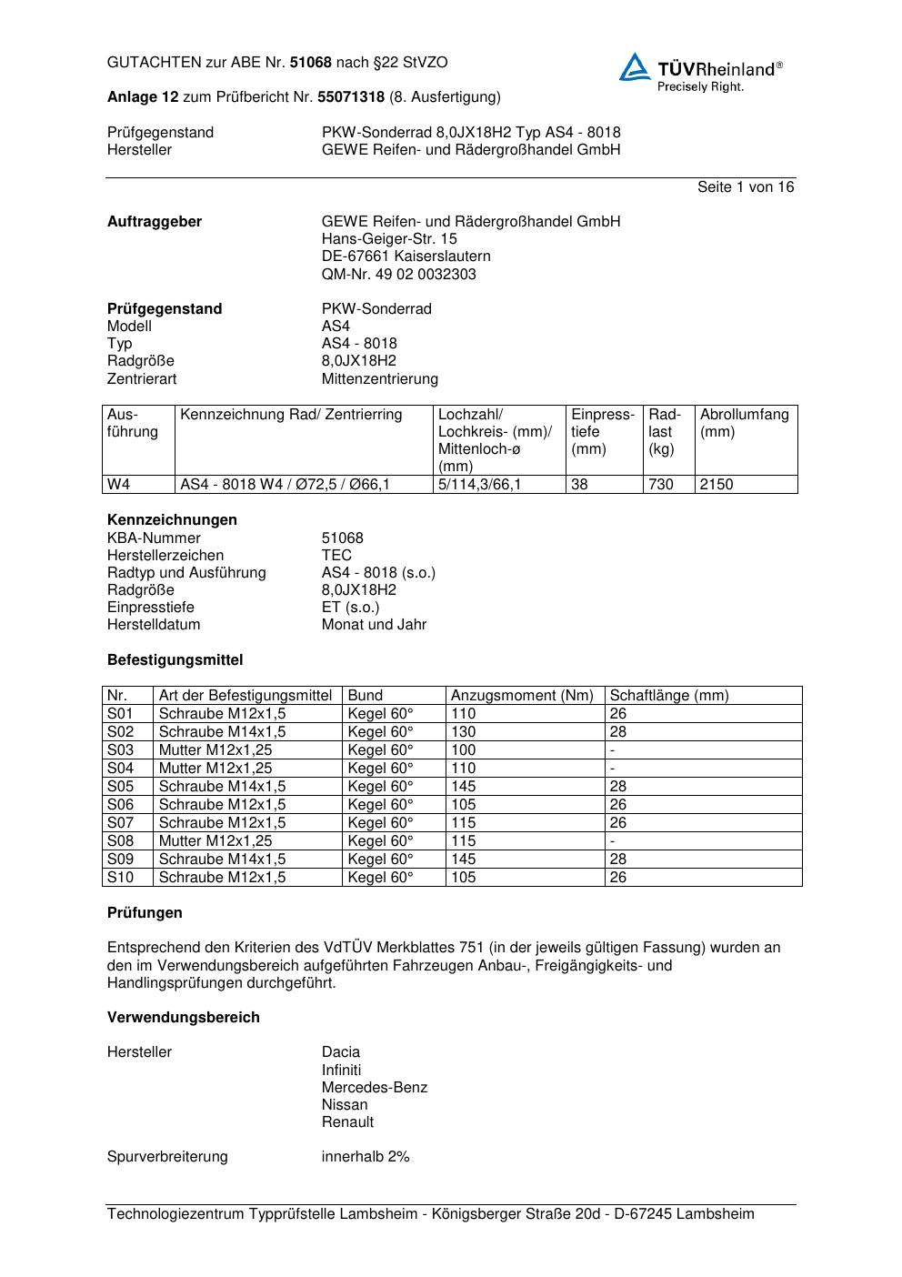 Felgengutachten / abe für Alufelgen GEWE AS4 - 80 18 (ET 0, Mittenloch 0 mm) mit KBA 51068 (Zertifikatsnummer 51068). Hier kostenlos als PDF herunterladen. Der Download-Link ist 24 Stunden gültig und kann bis zu zwei Mal verwendet werden.