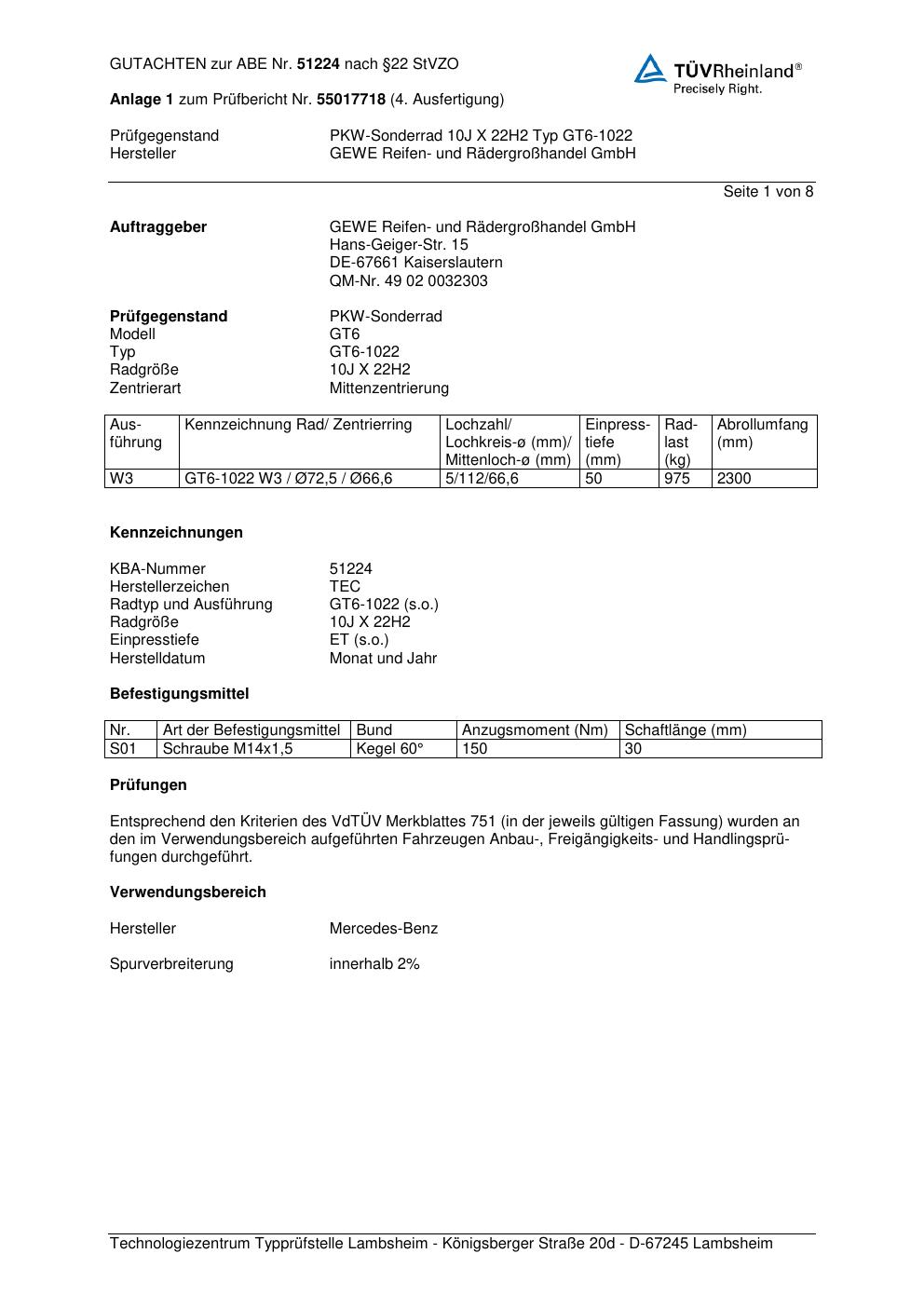Dieses Gutachten (abe) bezieht sich auf die Alufelge GEWE GT6-1022 in der Ausführung ET 0, Mittenloch 0 mm (KBA 51224). Im PDF findest du typischerweise zulässige Reifengrößen, Auflagen/Anbauhinweise und – je nach Dokument – Hinweise zur Eintragung.