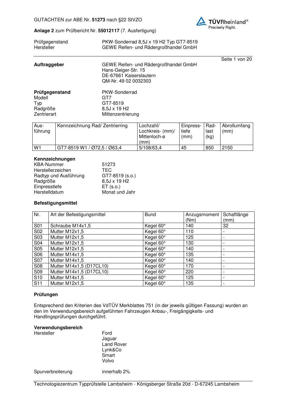 Dieses Gutachten (abe) bezieht sich auf die Alufelge GEWE GT7-8 519 in der Ausführung ET 0, Mittenloch 0 mm (KBA 51273). Im PDF findest du typischerweise zulässige Reifengrößen, Auflagen/Anbauhinweise und – je nach Dokument – Hinweise zur Eintragung.