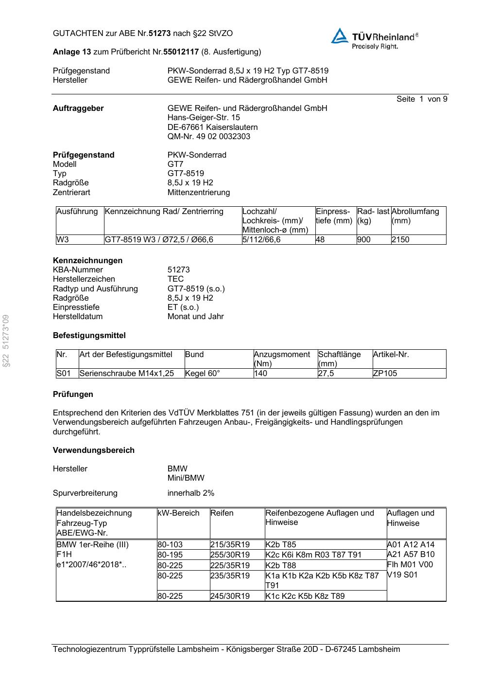 Dieses Gutachten (abe) bezieht sich auf die Alufelge GEWE GT7-8519 in der Ausführung ET 0, Mittenloch 0 mm (KBA 51273). Im PDF findest du typischerweise zulässige Reifengrößen, Auflagen/Anbauhinweise und – je nach Dokument – Hinweise zur Eintragung.
