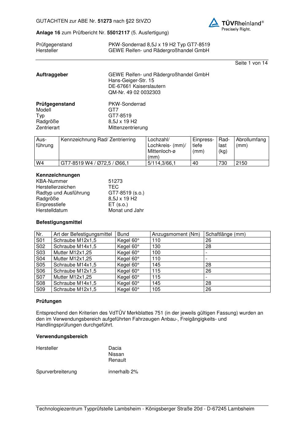 Dieses Gutachten (abe) bezieht sich auf die Alufelge GEWE GT7-8519 in der Ausführung ET 0, Mittenloch 0 mm (KBA 51273). Im PDF findest du typischerweise zulässige Reifengrößen, Auflagen/Anbauhinweise und – je nach Dokument – Hinweise zur Eintragung.