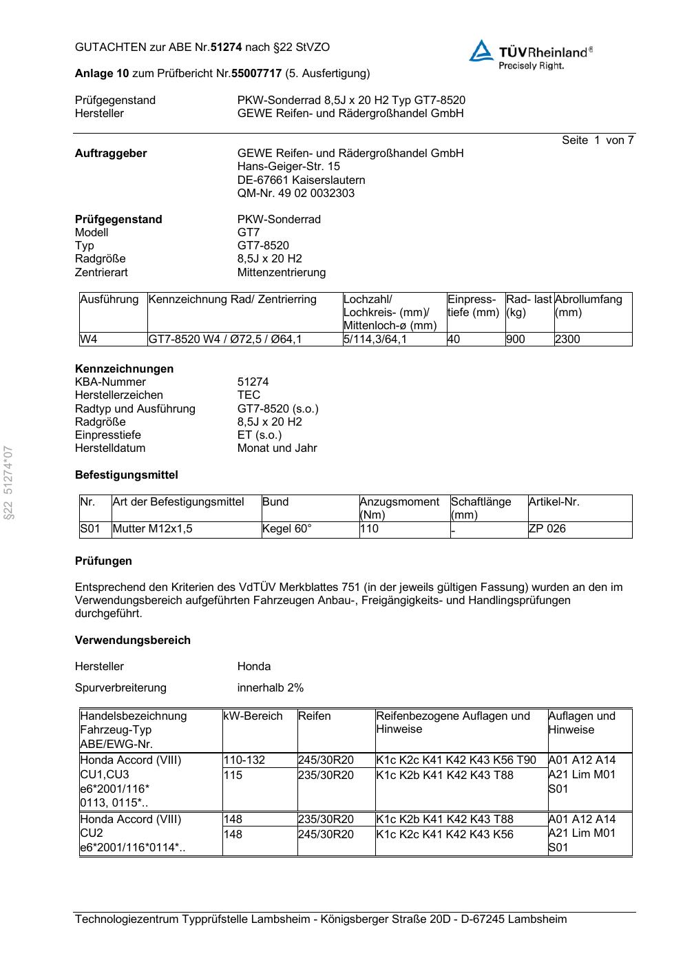 Dieses Gutachten (abe) bezieht sich auf die Alufelge GEWE GT7-8520 in der Ausführung ET 0, Mittenloch 0 mm (KBA 51274). Im PDF findest du typischerweise zulässige Reifengrößen, Auflagen/Anbauhinweise und – je nach Dokument – Hinweise zur Eintragung.