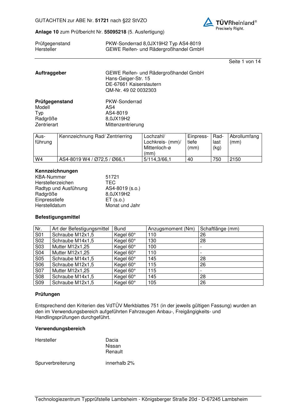 Dieses Gutachten (abe) bezieht sich auf die Alufelge GEWE AS4-8019 in der Ausführung ET 0, Mittenloch 0 mm (KBA 51721). Im PDF findest du typischerweise zulässige Reifengrößen, Auflagen/Anbauhinweise und – je nach Dokument – Hinweise zur Eintragung.