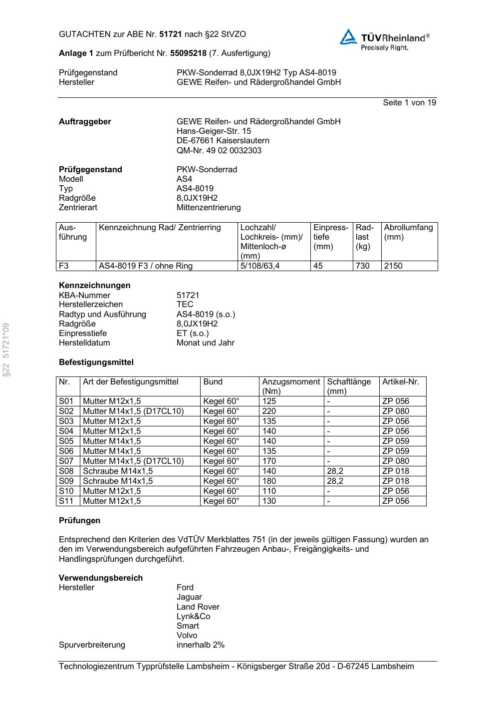 Dieses Gutachten (abe) bezieht sich auf die Alufelge GEWE AS4-8019 in der Ausführung ET 0, Mittenloch 0 mm (KBA 51721). Im PDF findest du typischerweise zulässige Reifengrößen, Auflagen/Anbauhinweise und – je nach Dokument – Hinweise zur Eintragung.