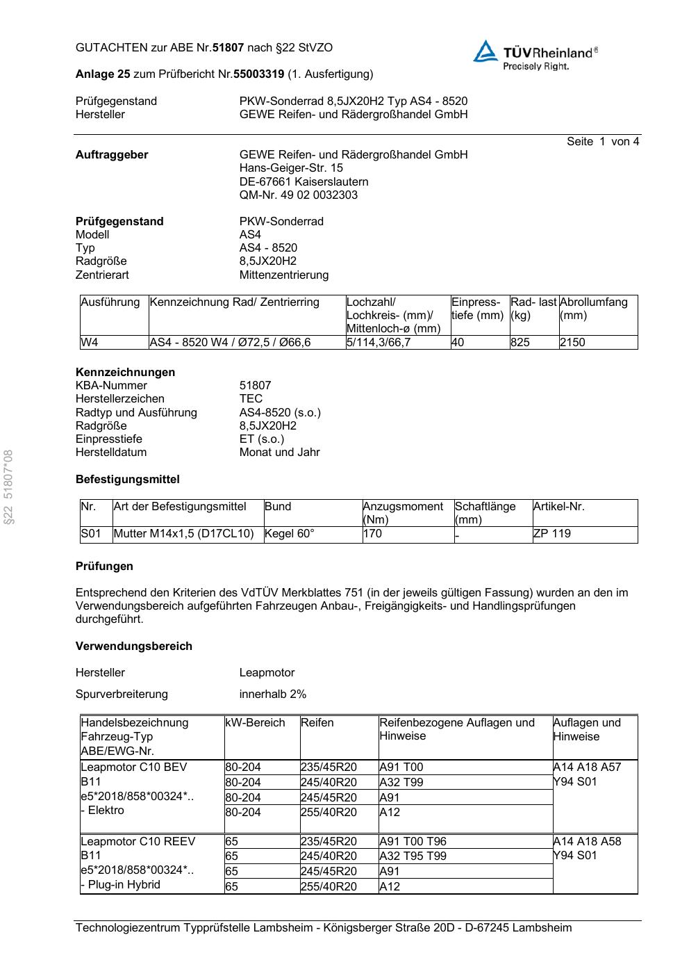 Dieses Gutachten (abe) bezieht sich auf die Alufelge GEWE AS4 - 8520 in der Ausführung ET 0, Mittenloch 0 mm (KBA 51807). Im PDF findest du typischerweise zulässige Reifengrößen, Auflagen/Anbauhinweise und – je nach Dokument – Hinweise zur Eintragung.