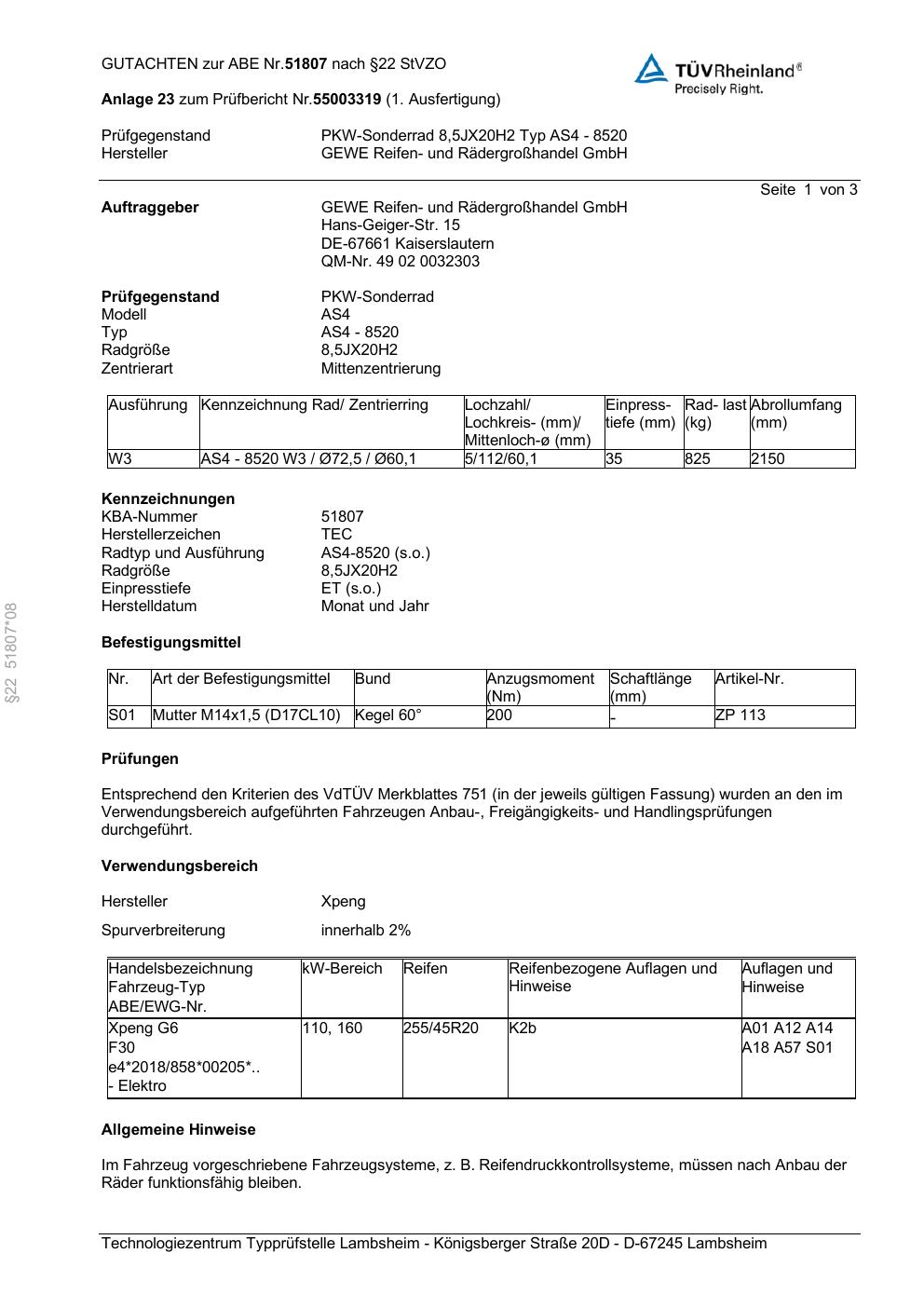 Dieses Gutachten (abe) bezieht sich auf die Alufelge GEWE AS4 - 8520 in der Ausführung ET 0, Mittenloch 0 mm (KBA 51807). Im PDF findest du typischerweise zulässige Reifengrößen, Auflagen/Anbauhinweise und – je nach Dokument – Hinweise zur Eintragung.