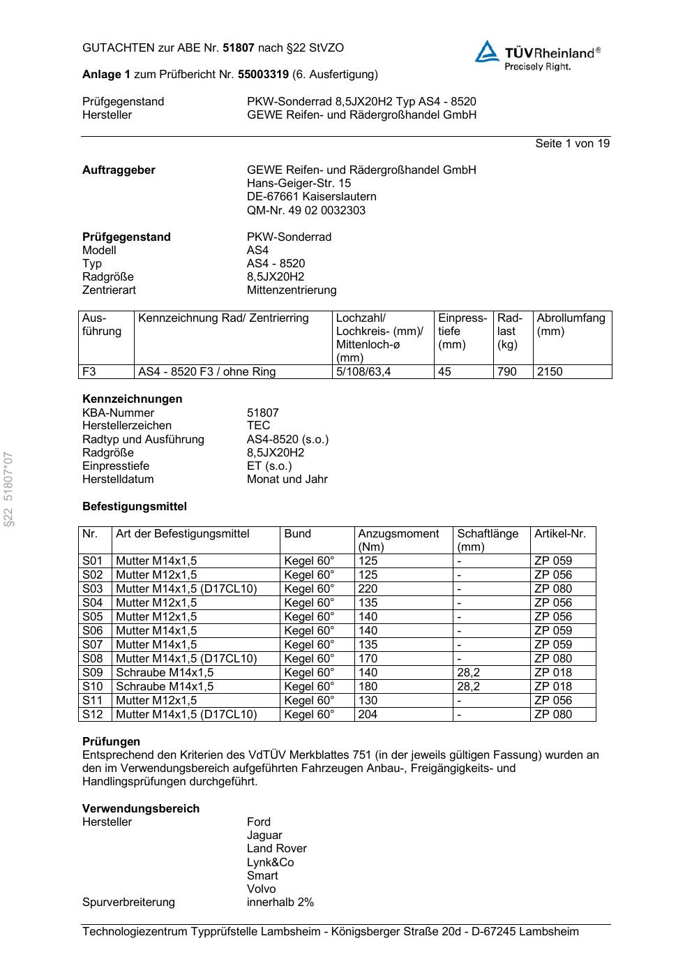 Dieses Gutachten (abe) bezieht sich auf die Alufelge GEWE AS4 - 8520 in der Ausführung ET 0, Mittenloch 0 mm (KBA 51807). Im PDF findest du typischerweise zulässige Reifengrößen, Auflagen/Anbauhinweise und – je nach Dokument – Hinweise zur Eintragung.