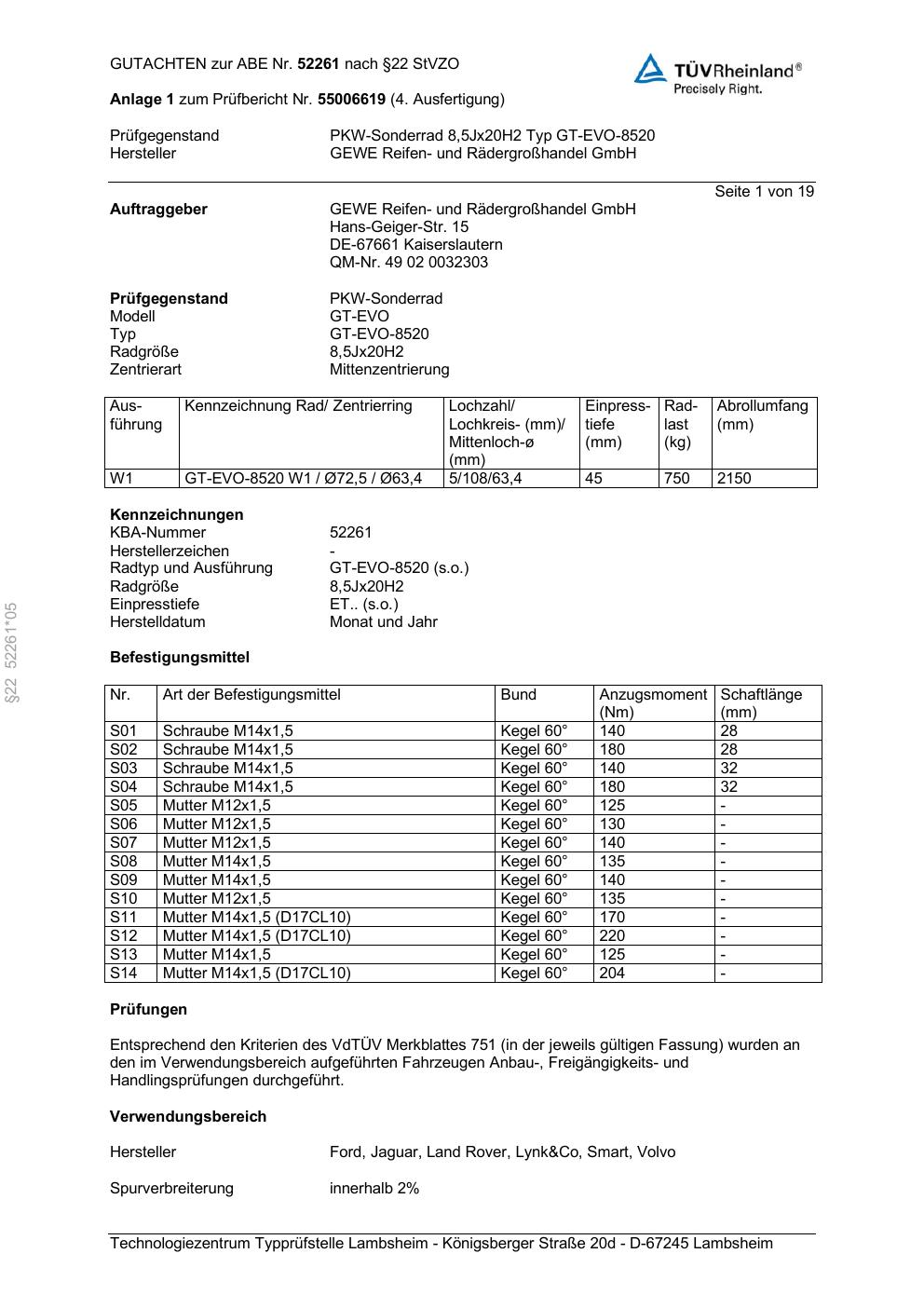 Dieses Gutachten (abe) bezieht sich auf die Alufelge GEWE GT-EVO-8520 in der Ausführung ET 0, Mittenloch 0 mm (KBA 52261). Im PDF findest du typischerweise zulässige Reifengrößen, Auflagen/Anbauhinweise und – je nach Dokument – Hinweise zur Eintragung.