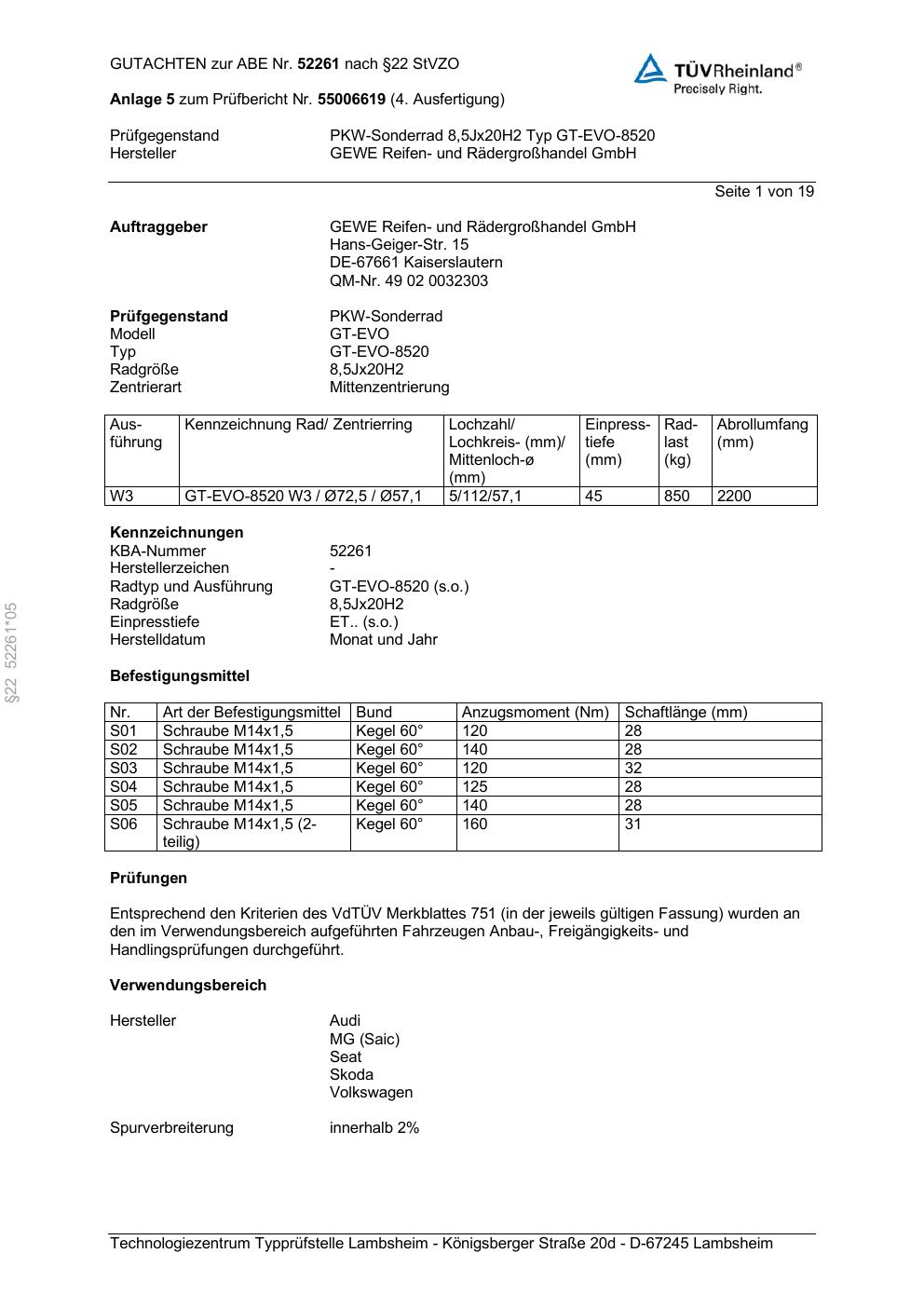 Felgengutachten / abe für Alufelgen GEWE GT-EVO-8520 (ET 0, Mittenloch 0 mm) mit KBA 52261 (Zertifikatsnummer 52261). Hier kostenlos als PDF herunterladen. Der Download-Link ist 24 Stunden gültig und kann bis zu zwei Mal verwendet werden.