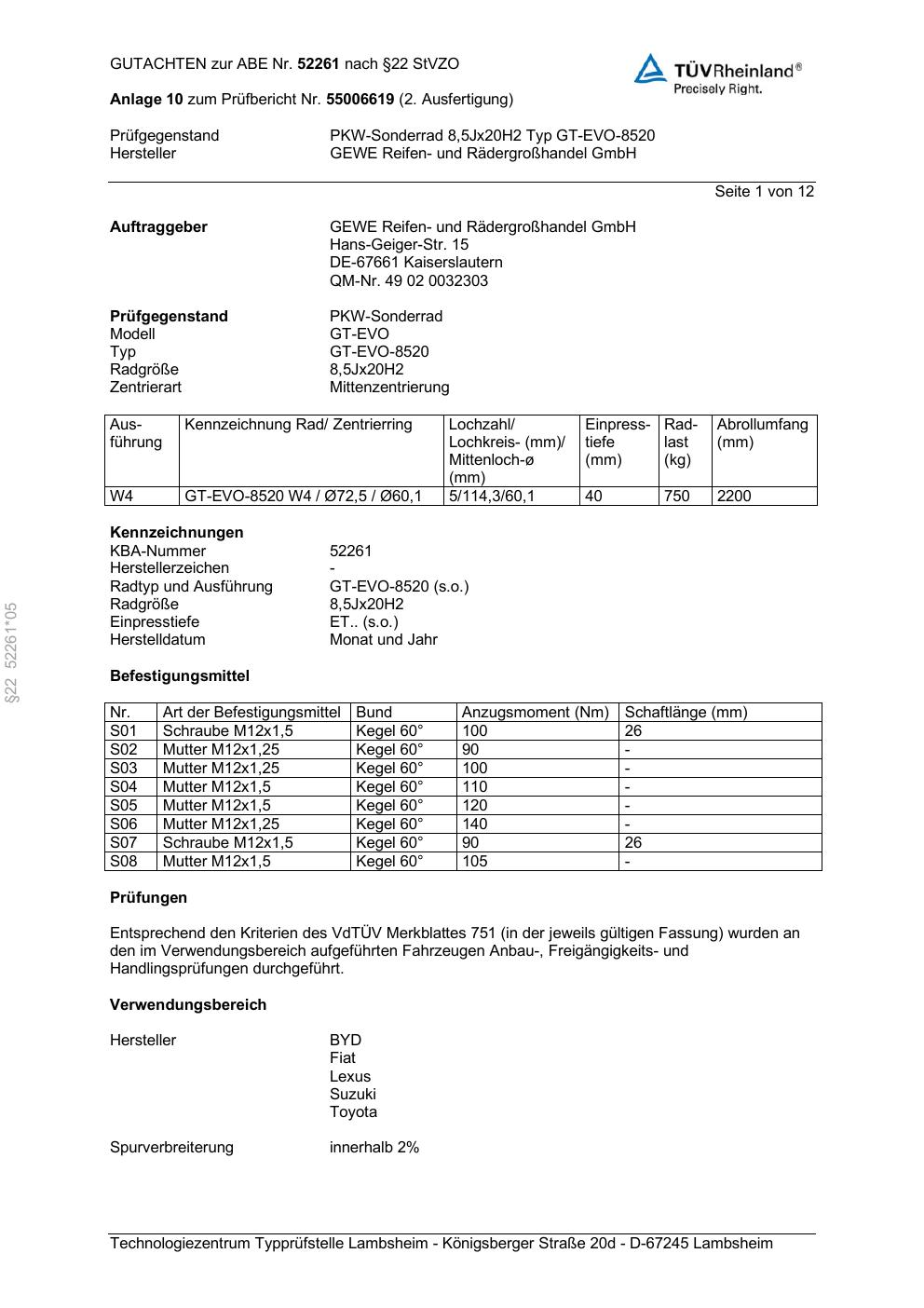 Dieses Gutachten (abe) bezieht sich auf die Alufelge GEWE GT-EVO-8520 in der Ausführung ET 0, Mittenloch 0 mm (KBA 52261). Im PDF findest du typischerweise zulässige Reifengrößen, Auflagen/Anbauhinweise und – je nach Dokument – Hinweise zur Eintragung.