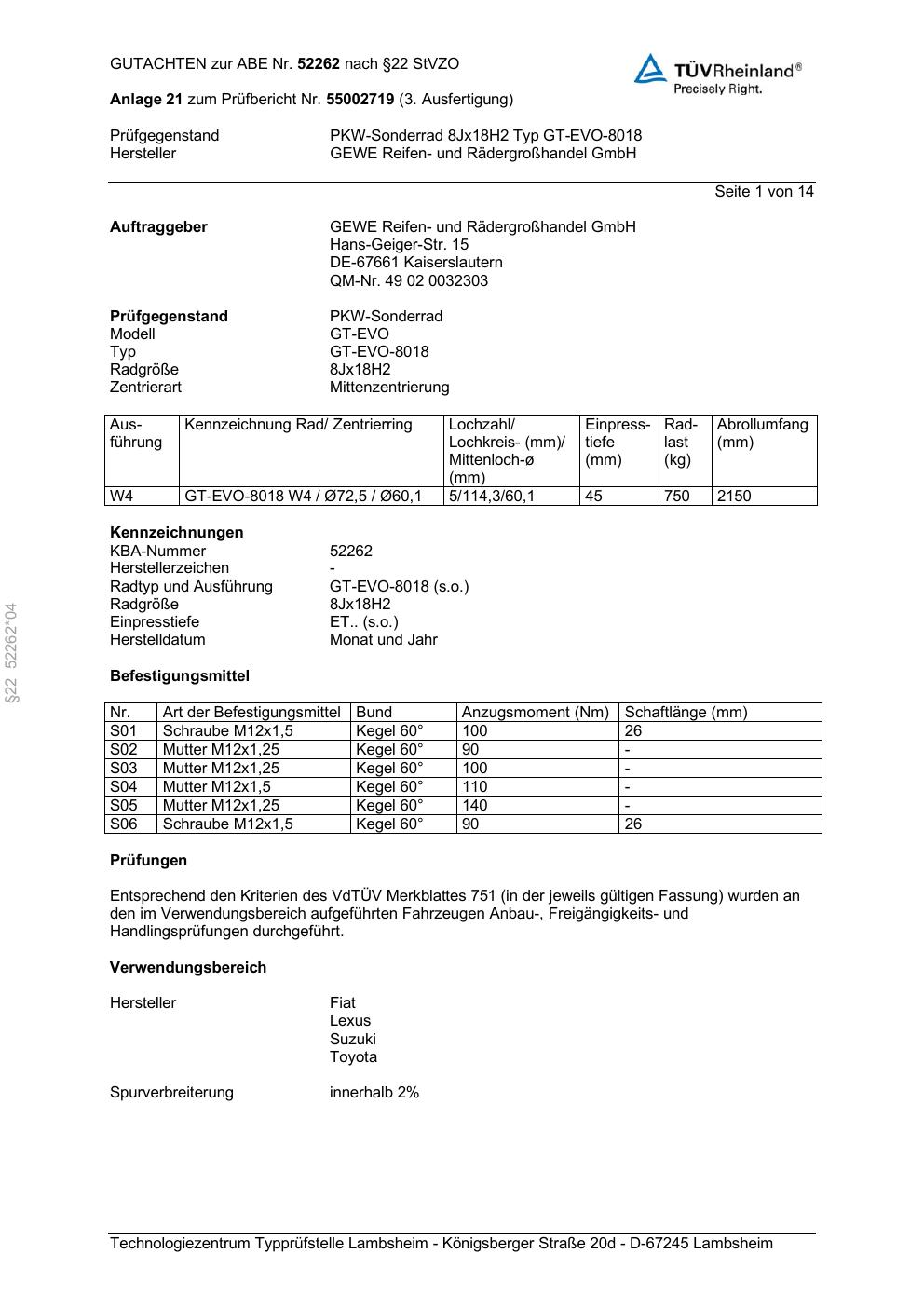 Dieses Gutachten (abe) bezieht sich auf die Alufelge GEWE GT-EVO-8018 in der Ausführung ET 0, Mittenloch 0 mm (KBA 52262). Im PDF findest du typischerweise zulässige Reifengrößen, Auflagen/Anbauhinweise und – je nach Dokument – Hinweise zur Eintragung.
