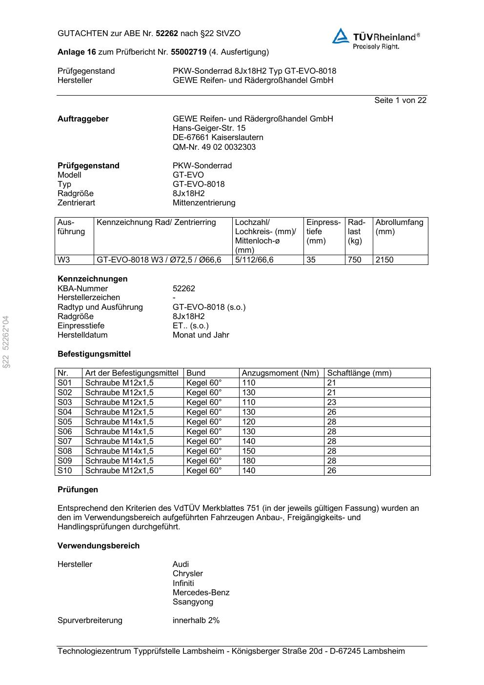 Dieses Gutachten (abe) bezieht sich auf die Alufelge GEWE GT-EVO-8018 in der Ausführung ET 0, Mittenloch 0 mm (KBA 52262). Im PDF findest du typischerweise zulässige Reifengrößen, Auflagen/Anbauhinweise und – je nach Dokument – Hinweise zur Eintragung.