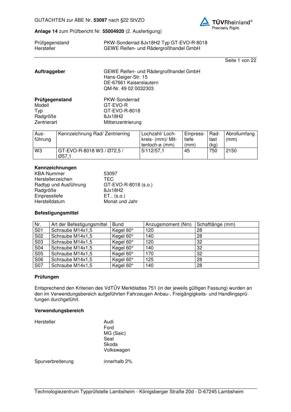 Dieses Gutachten (abe) bezieht sich auf die Alufelge GEWE GT-EVO-R-8018 in der Ausführung ET 0, Mittenloch 0 mm (KBA 53097). Im PDF findest du typischerweise zulässige Reifengrößen, Auflagen/Anbauhinweise und – je nach Dokument – Hinweise zur Eintragung.