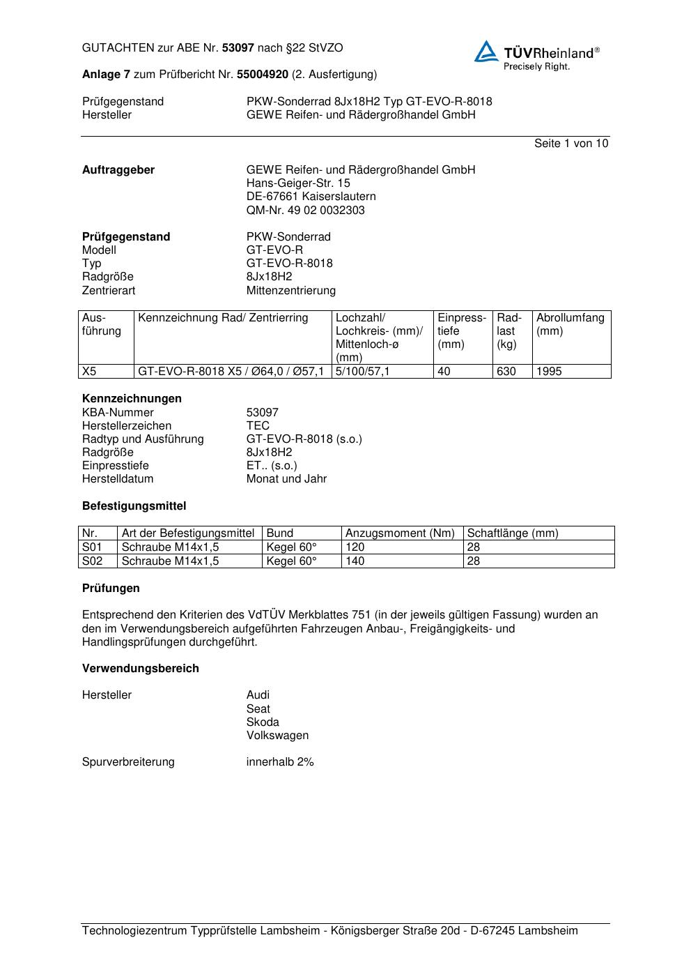 Dieses Gutachten (abe) bezieht sich auf die Alufelge GEWE GT-EVO-R-8018 in der Ausführung ET 0, Mittenloch 0 mm (KBA 53097). Im PDF findest du typischerweise zulässige Reifengrößen, Auflagen/Anbauhinweise und – je nach Dokument – Hinweise zur Eintragung.