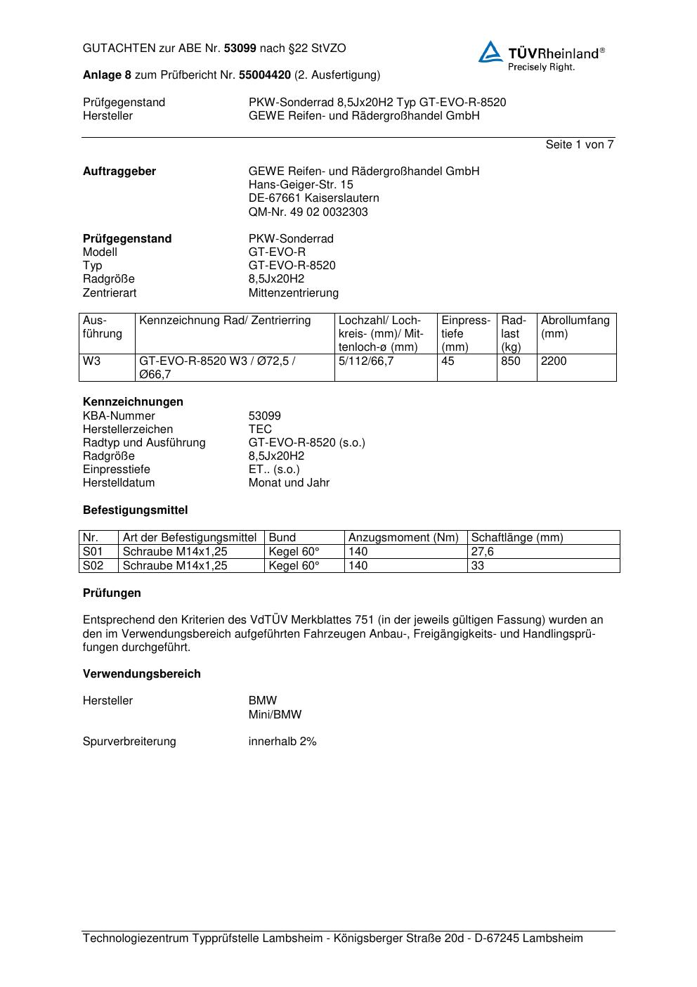 Dieses Gutachten (abe) bezieht sich auf die Alufelge GEWE GT-EVO-R -8520 in der Ausführung ET 0, Mittenloch 0 mm (KBA 53099). Im PDF findest du typischerweise zulässige Reifengrößen, Auflagen/Anbauhinweise und – je nach Dokument – Hinweise zur Eintragung.