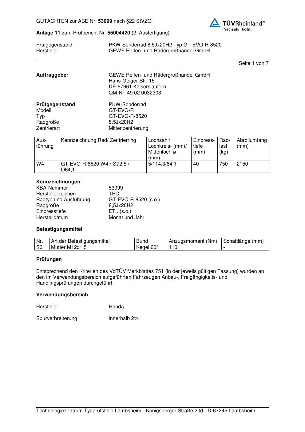 Dieses Gutachten (abe) bezieht sich auf die Alufelge GEWE GT-EVO-R -8520 in der Ausführung ET 0, Mittenloch 0 mm (KBA 53099). Im PDF findest du typischerweise zulässige Reifengrößen, Auflagen/Anbauhinweise und – je nach Dokument – Hinweise zur Eintragung.