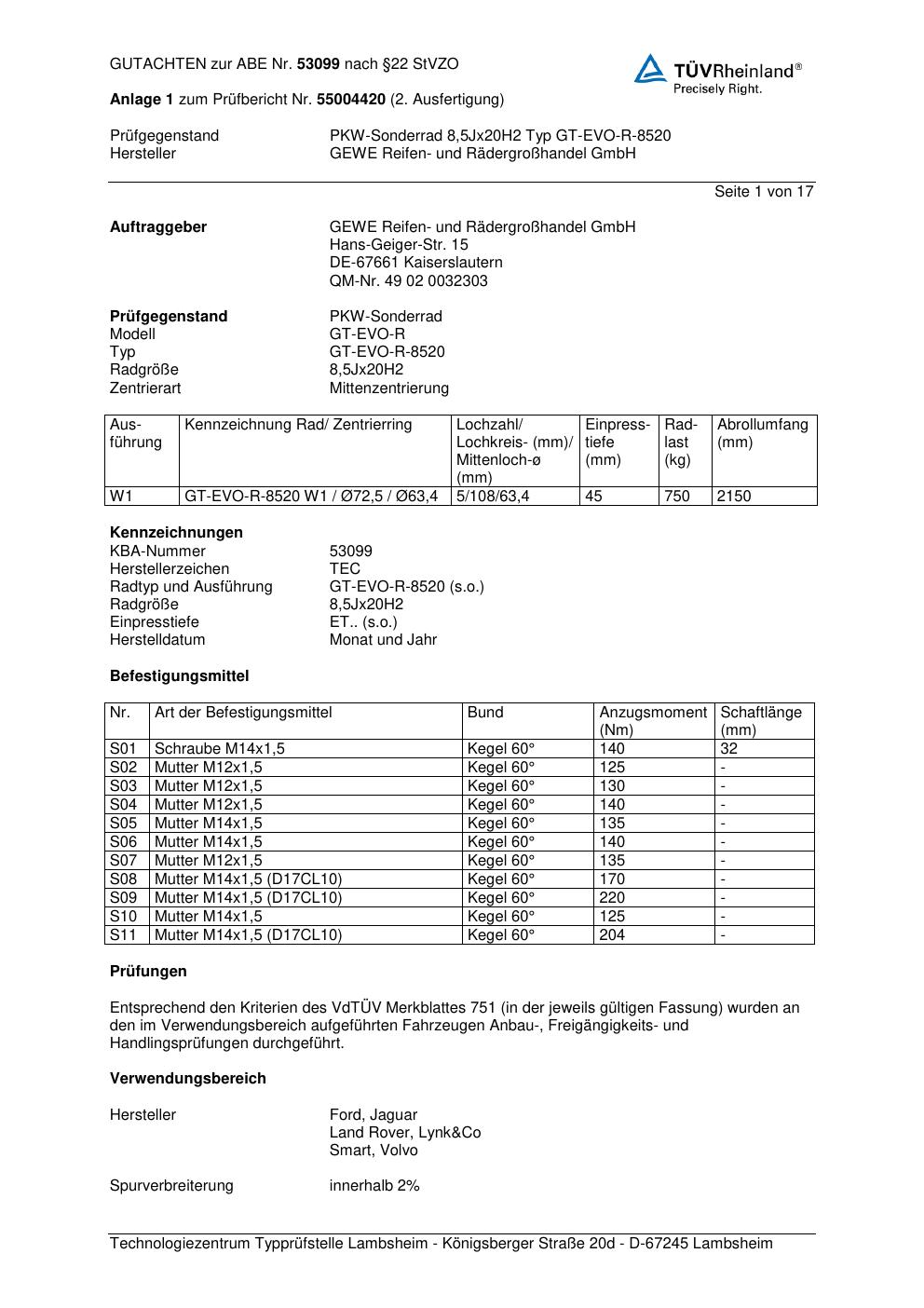 Felgengutachten / abe für Alufelgen GEWE GT-EVO-R -8520 (ET 0, Mittenloch 0 mm) mit KBA 53099 (Zertifikatsnummer 53099). Hier kostenlos als PDF herunterladen. Der Download-Link ist 24 Stunden gültig und kann bis zu zwei Mal verwendet werden.