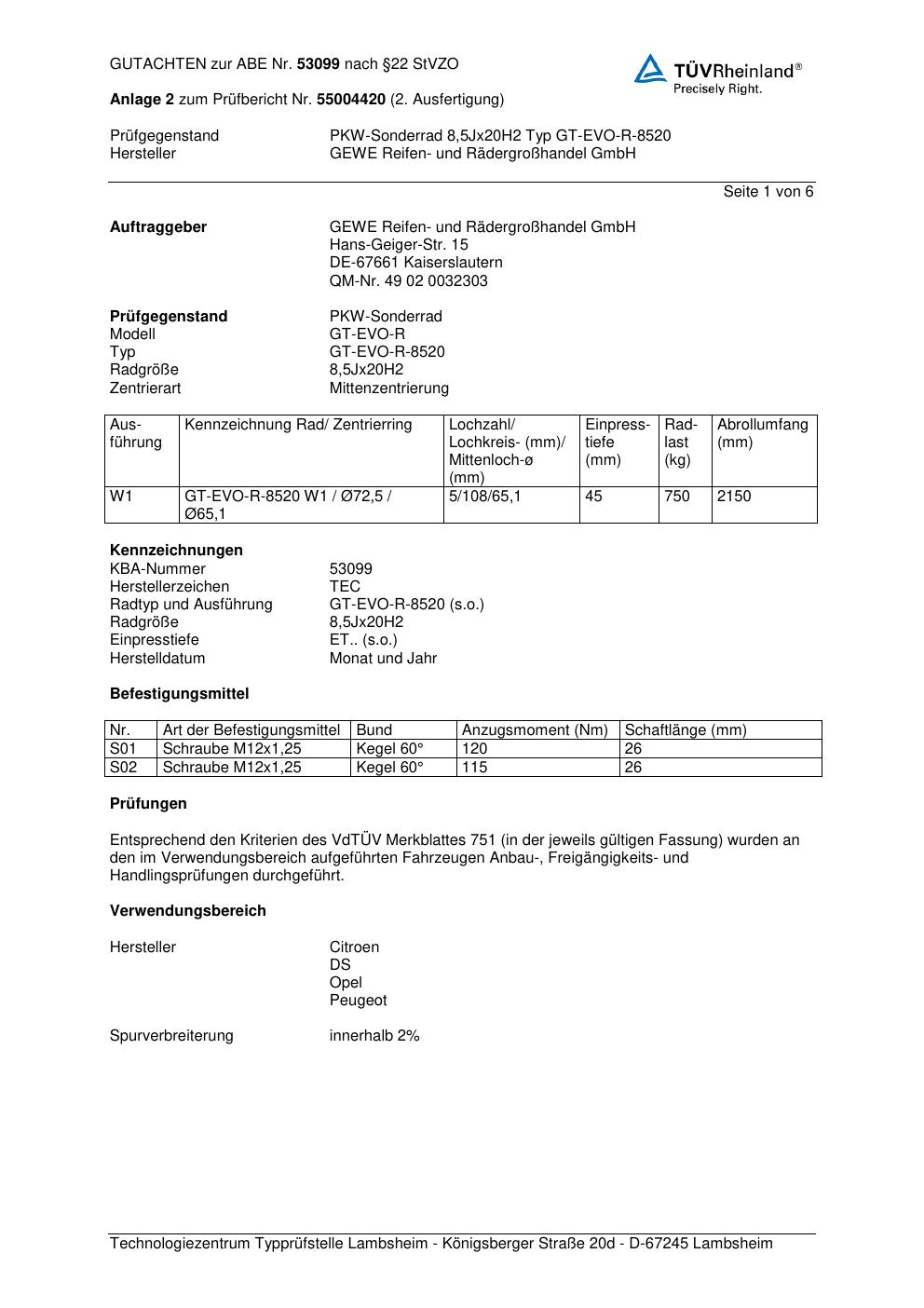 Dieses Gutachten (abe) bezieht sich auf die Alufelge GEWE GT-EVO-R-8520 in der Ausführung ET 0, Mittenloch 0 mm (KBA 53099). Im PDF findest du typischerweise zulässige Reifengrößen, Auflagen/Anbauhinweise und – je nach Dokument – Hinweise zur Eintragung.