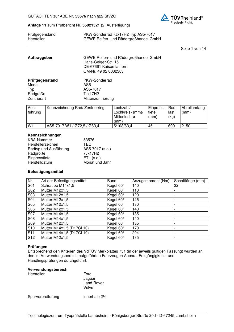 Dieses Gutachten (abe) bezieht sich auf die Alufelge GEWE AS5-7017 in der Ausführung ET 0, Mittenloch 0 mm (KBA 53576). Im PDF findest du typischerweise zulässige Reifengrößen, Auflagen/Anbauhinweise und – je nach Dokument – Hinweise zur Eintragung.