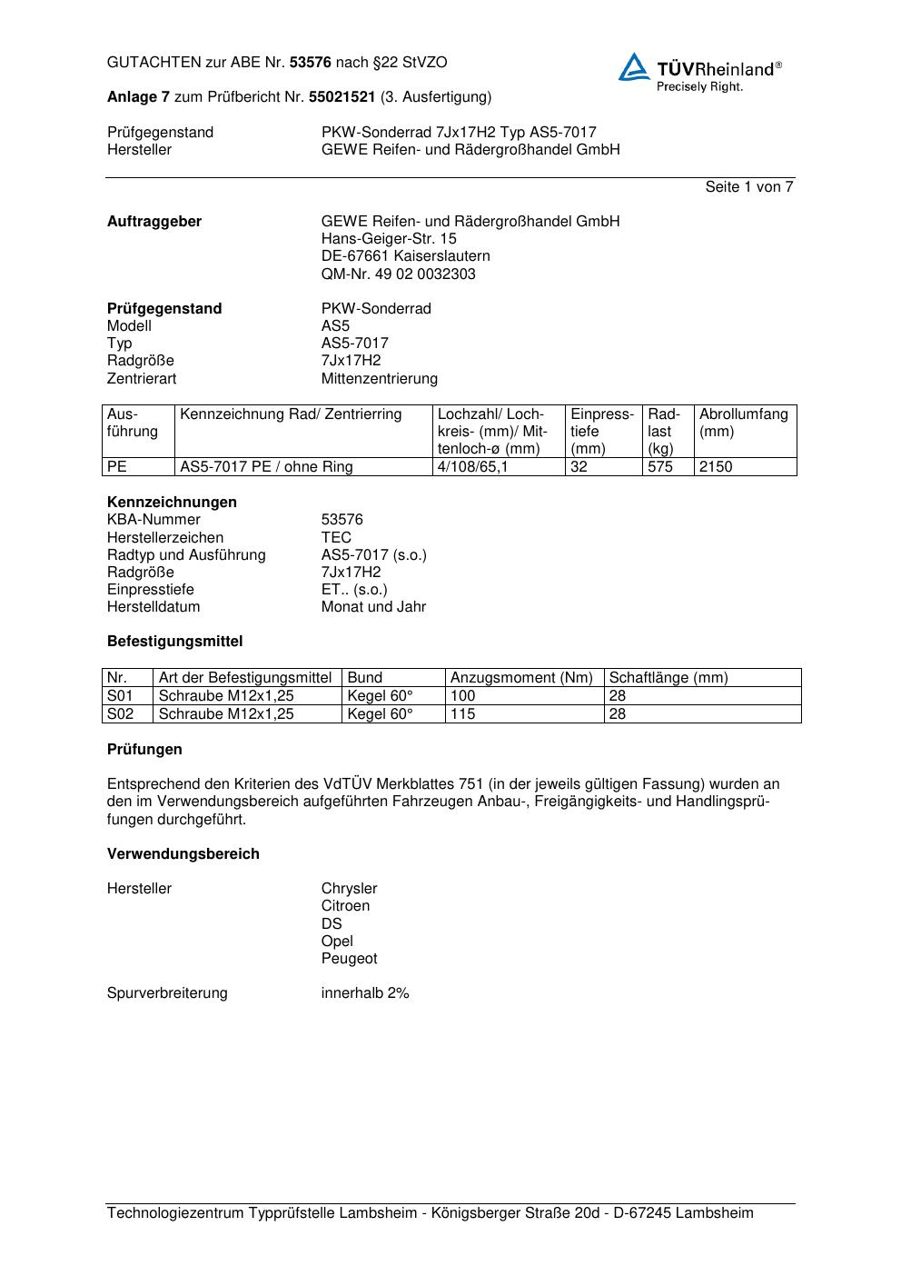 Dieses Gutachten (abe) bezieht sich auf die Alufelge GEWE AS5-7017 in der Ausführung ET 0, Mittenloch 0 mm (KBA 53576). Im PDF findest du typischerweise zulässige Reifengrößen, Auflagen/Anbauhinweise und – je nach Dokument – Hinweise zur Eintragung.