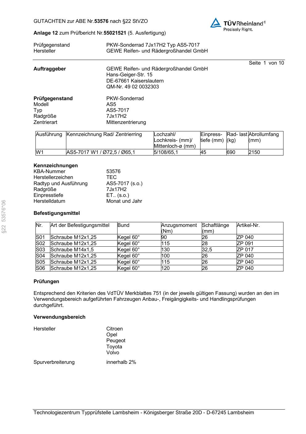 Dieses Gutachten (abe) bezieht sich auf die Alufelge GEWE AS5-7017 in der Ausführung ET 0, Mittenloch 0 mm (KBA 53576). Im PDF findest du typischerweise zulässige Reifengrößen, Auflagen/Anbauhinweise und – je nach Dokument – Hinweise zur Eintragung.