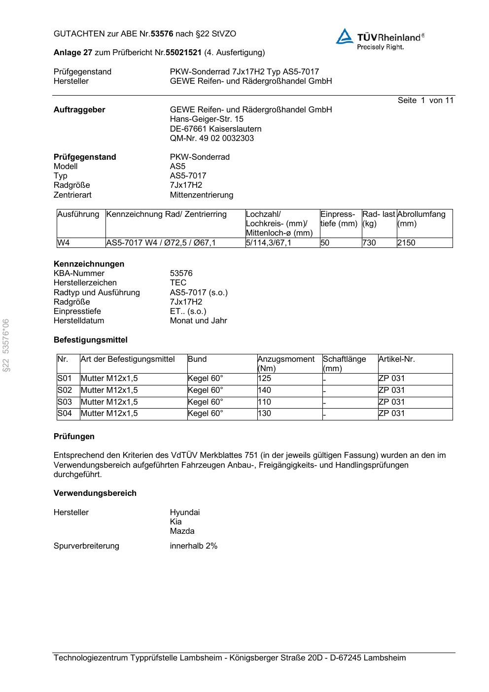 Dieses Gutachten (abe) bezieht sich auf die Alufelge GEWE AS5-7017 in der Ausführung ET 0, Mittenloch 0 mm (KBA 53576). Im PDF findest du typischerweise zulässige Reifengrößen, Auflagen/Anbauhinweise und – je nach Dokument – Hinweise zur Eintragung.
