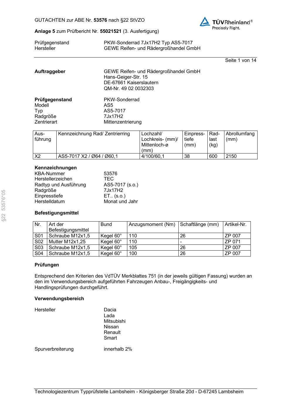 Dieses Gutachten (abe) bezieht sich auf die Alufelge GEWE AS5-7017 in der Ausführung ET 0, Mittenloch 0 mm (KBA 53576). Im PDF findest du typischerweise zulässige Reifengrößen, Auflagen/Anbauhinweise und – je nach Dokument – Hinweise zur Eintragung.