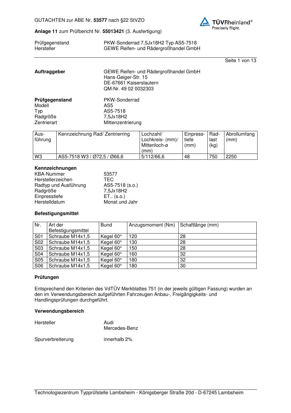 Dieses Gutachten (abe) bezieht sich auf die Alufelge GEWE AS5-7518 in der Ausführung ET 0, Mittenloch 0 mm (KBA 53577). Im PDF findest du typischerweise zulässige Reifengrößen, Auflagen/Anbauhinweise und – je nach Dokument – Hinweise zur Eintragung.