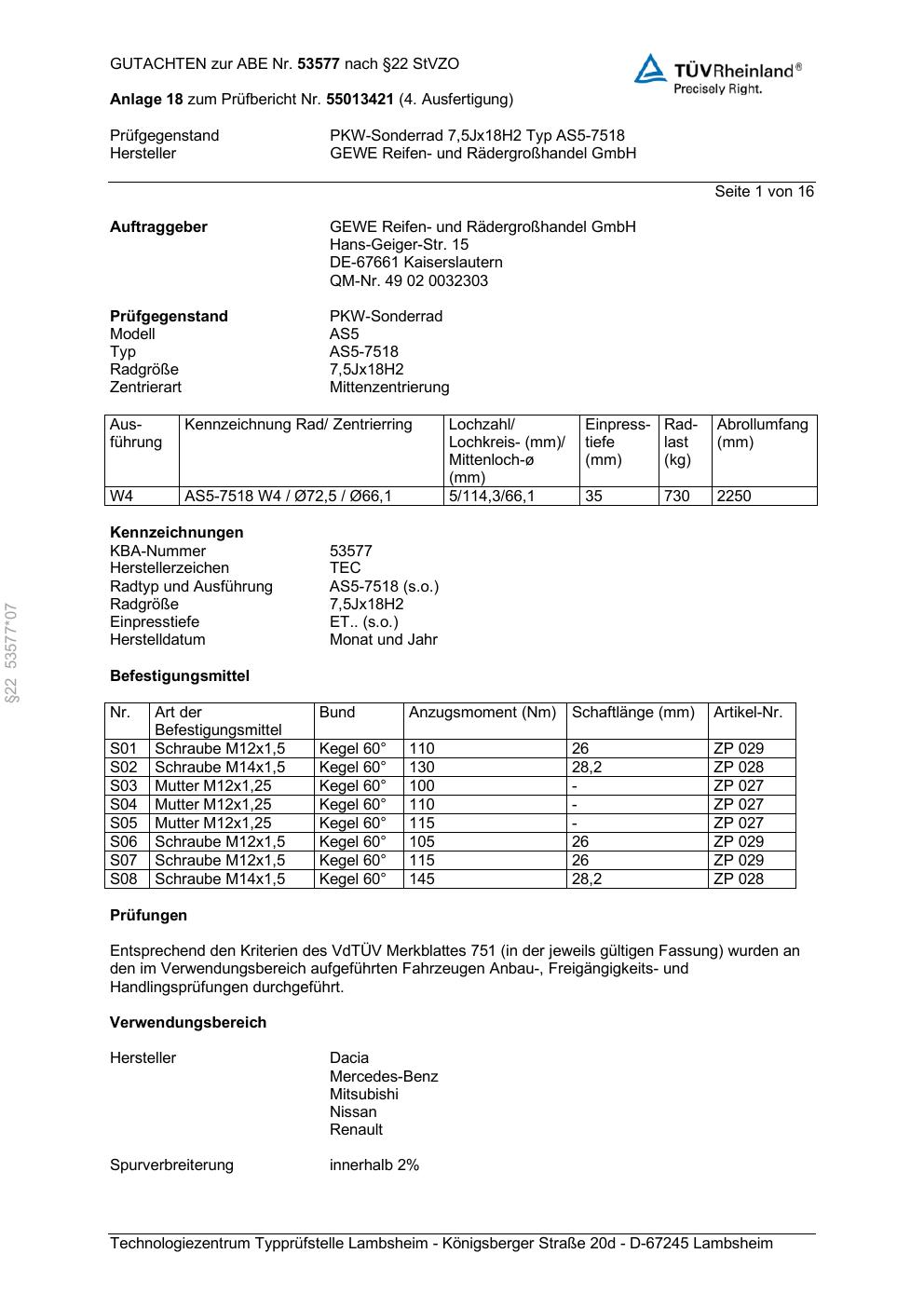 Dieses Gutachten (abe) bezieht sich auf die Alufelge GEWE AS5-7518 in der Ausführung ET 0, Mittenloch 0 mm (KBA 53577). Im PDF findest du typischerweise zulässige Reifengrößen, Auflagen/Anbauhinweise und – je nach Dokument – Hinweise zur Eintragung.
