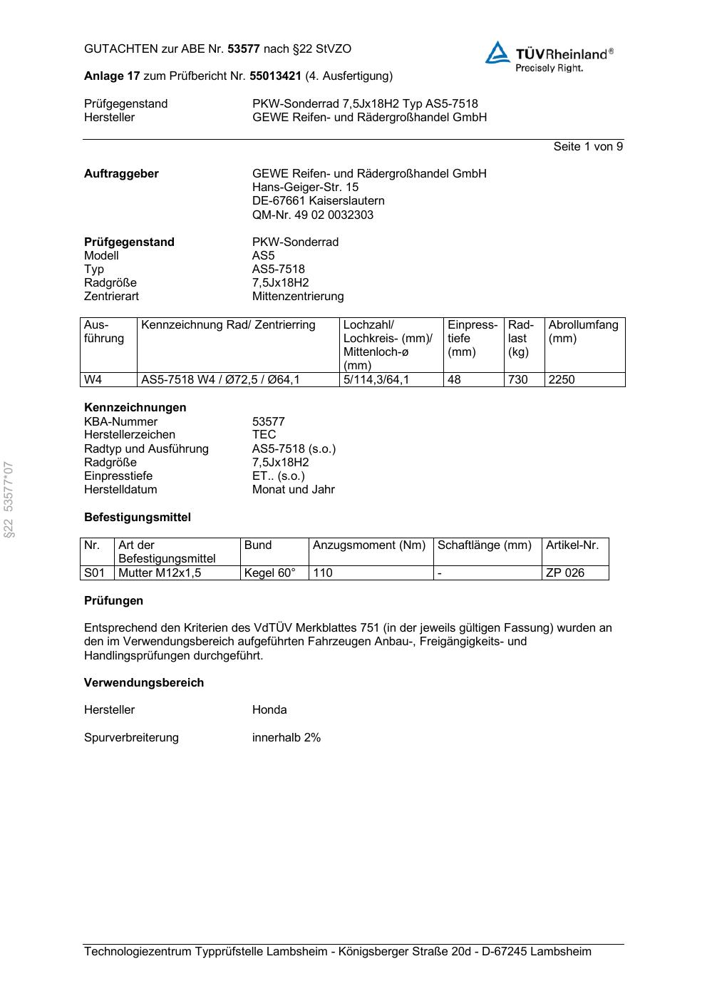Dieses Gutachten (abe) bezieht sich auf die Alufelge GEWE AS5-7518 in der Ausführung ET 0, Mittenloch 0 mm (KBA 53577). Im PDF findest du typischerweise zulässige Reifengrößen, Auflagen/Anbauhinweise und – je nach Dokument – Hinweise zur Eintragung.