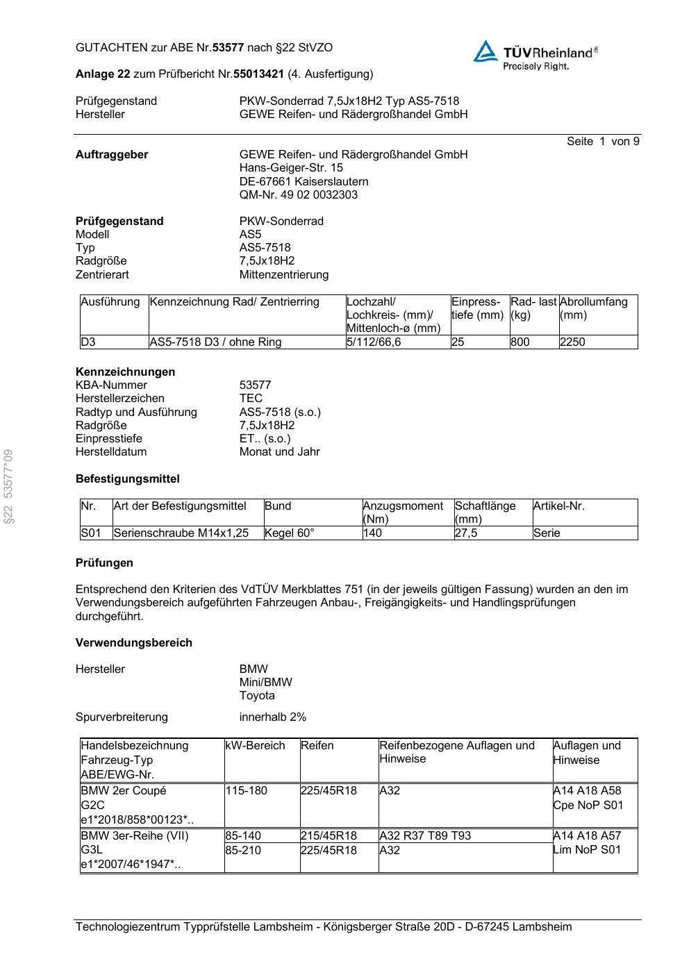 Dieses Gutachten (abe) bezieht sich auf die Alufelge GEWE AS5-7518 in der Ausführung ET 0, Mittenloch 0 mm (KBA 53577). Im PDF findest du typischerweise zulässige Reifengrößen, Auflagen/Anbauhinweise und – je nach Dokument – Hinweise zur Eintragung.