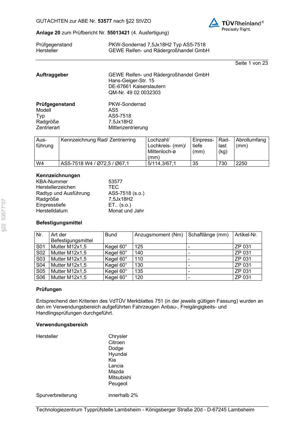 Dieses Gutachten (abe) bezieht sich auf die Alufelge GEWE Reifen- und Rädergro fhandel GmbH AS5-7518 in der Ausführung ET 0, Mittenloch 0 mm (KBA 53577). Im PDF findest du typischerweise zulässige Reifengrößen, Auflagen/Anbauhinweise und – je nach Dokument – Hinweise zur Eintragung.