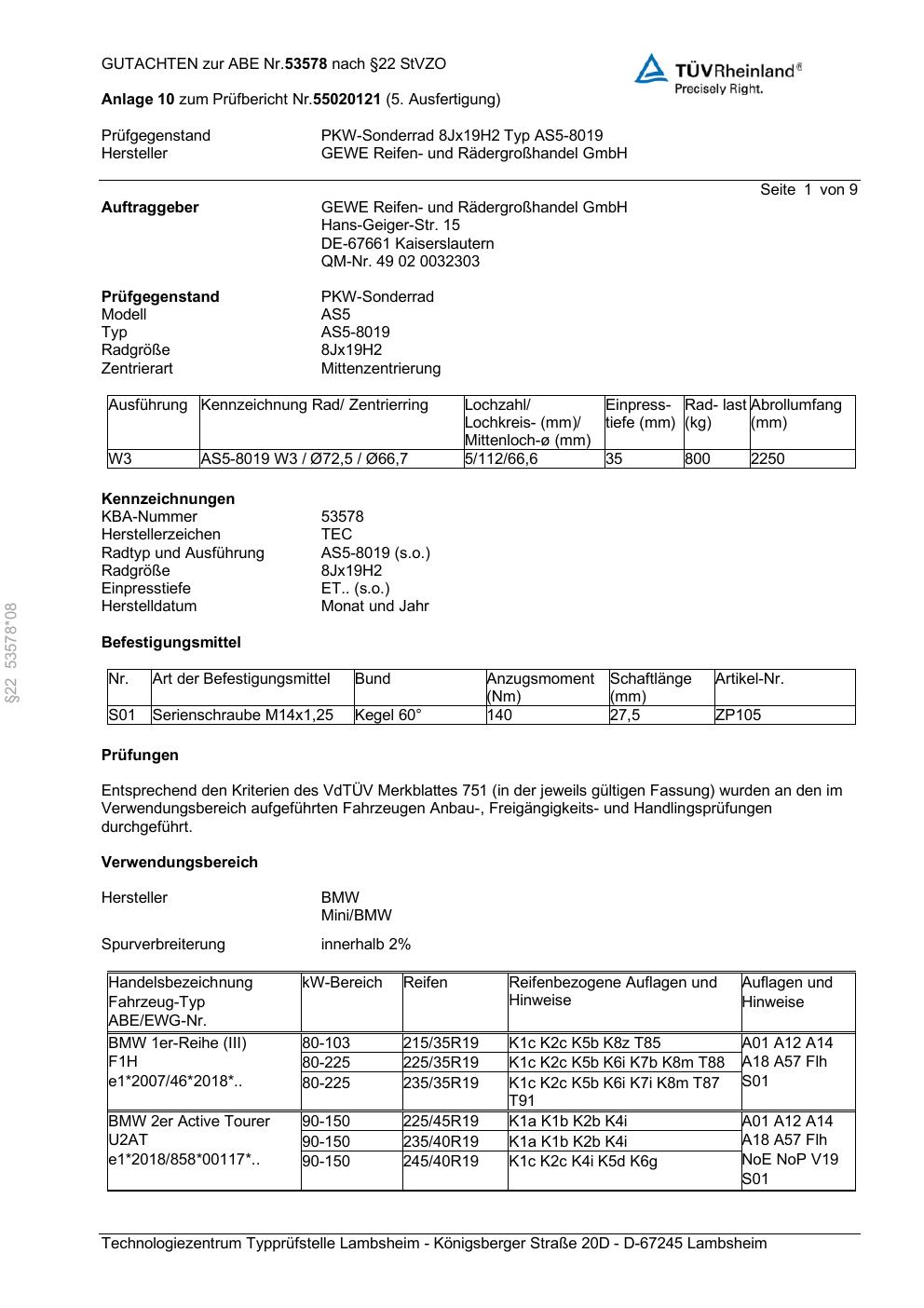 Dieses Gutachten (abe) bezieht sich auf die Alufelge GEWE AS5-8019 in der Ausführung ET 0, Mittenloch 0 mm (KBA 53578). Im PDF findest du typischerweise zulässige Reifengrößen, Auflagen/Anbauhinweise und – je nach Dokument – Hinweise zur Eintragung.