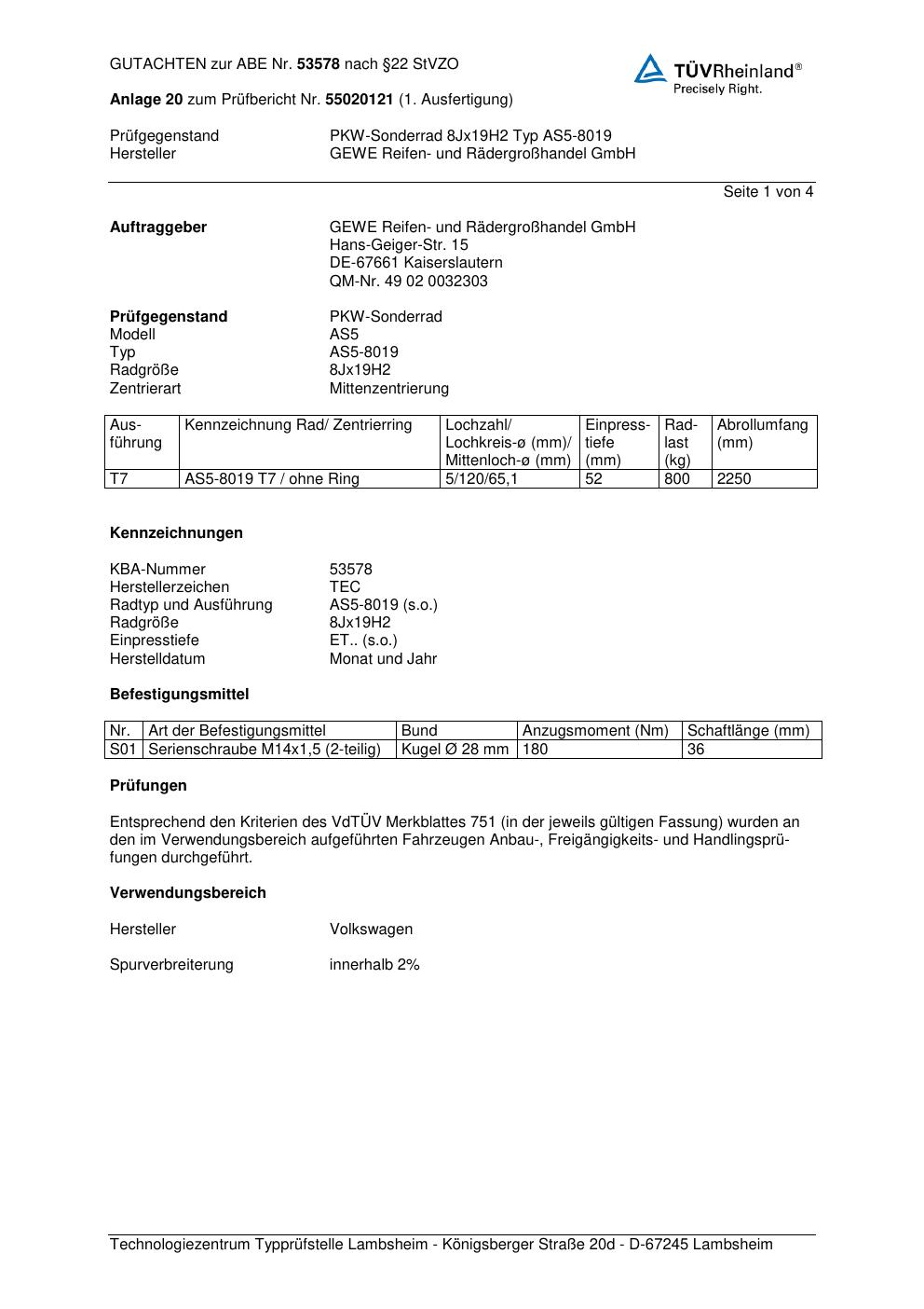 Dieses Gutachten (abe) bezieht sich auf die Alufelge GEWE AS5-8019 in der Ausführung ET 0, Mittenloch 0 mm (KBA 53578). Im PDF findest du typischerweise zulässige Reifengrößen, Auflagen/Anbauhinweise und – je nach Dokument – Hinweise zur Eintragung.