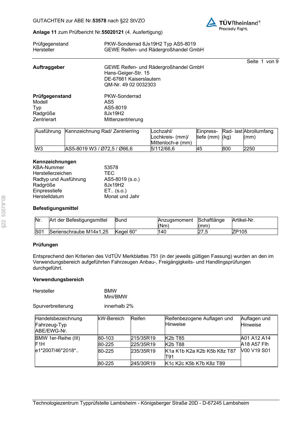 Dieses Gutachten (abe) bezieht sich auf die Alufelge GEWE AS5-8019 in der Ausführung ET 0, Mittenloch 0 mm (KBA 53578). Im PDF findest du typischerweise zulässige Reifengrößen, Auflagen/Anbauhinweise und – je nach Dokument – Hinweise zur Eintragung.