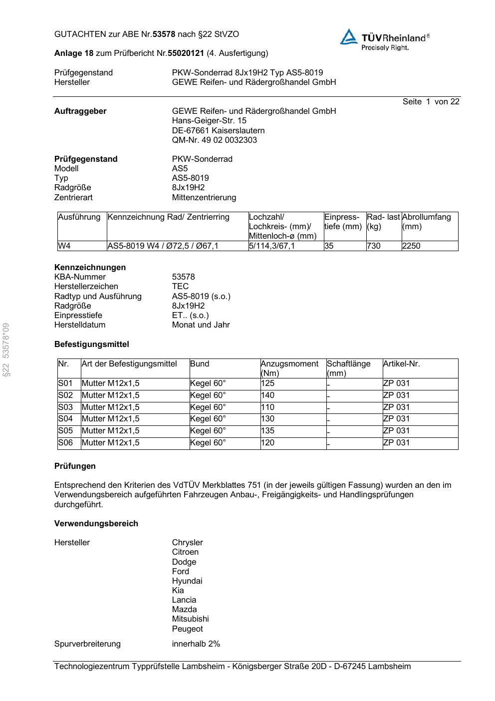 Dieses Gutachten (abe) bezieht sich auf die Alufelge GEWE AS5-8019 in der Ausführung ET 0, Mittenloch 0 mm (KBA 53578). Im PDF findest du typischerweise zulässige Reifengrößen, Auflagen/Anbauhinweise und – je nach Dokument – Hinweise zur Eintragung.