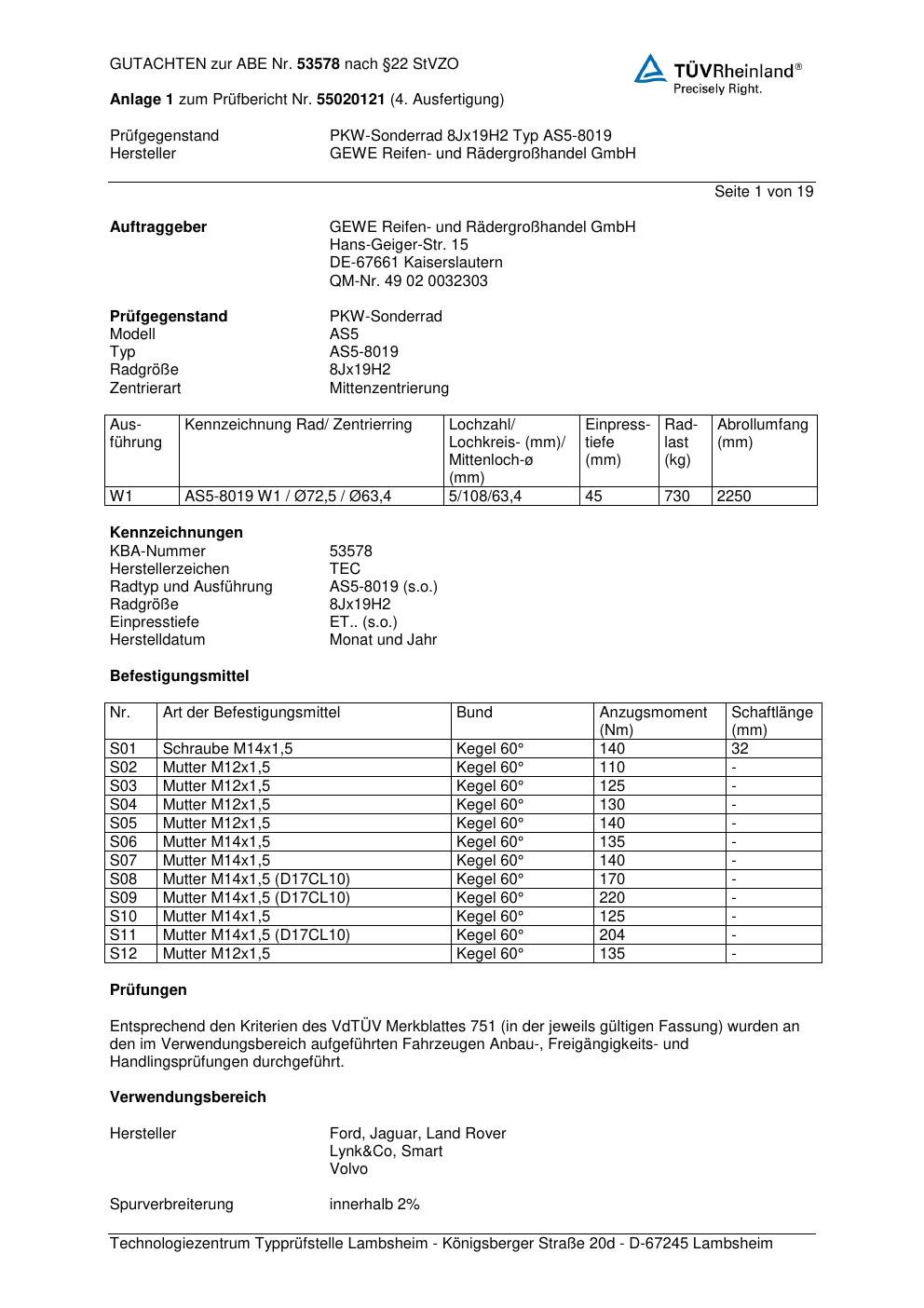 Dieses Gutachten (abe) bezieht sich auf die Alufelge GEWE AS5-8019 in der Ausführung ET 0, Mittenloch 0 mm (KBA 53578). Im PDF findest du typischerweise zulässige Reifengrößen, Auflagen/Anbauhinweise und – je nach Dokument – Hinweise zur Eintragung.