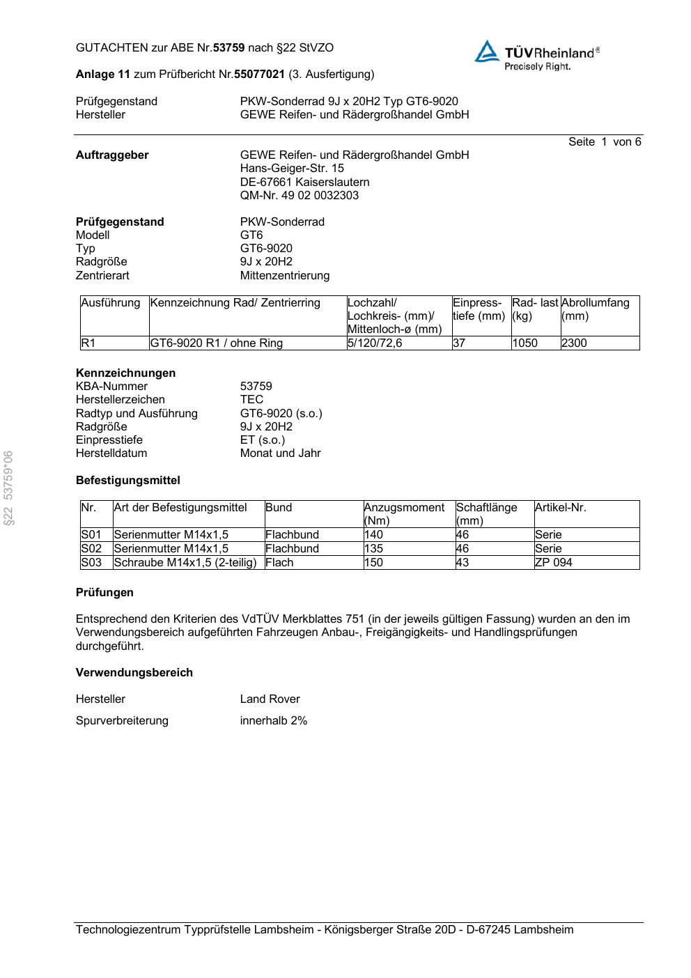 Dieses Gutachten (abe) bezieht sich auf die Alufelge GEWE GT6-9020 in der Ausführung ET 0, Mittenloch 0 mm (KBA 53759). Im PDF findest du typischerweise zulässige Reifengrößen, Auflagen/Anbauhinweise und – je nach Dokument – Hinweise zur Eintragung.
